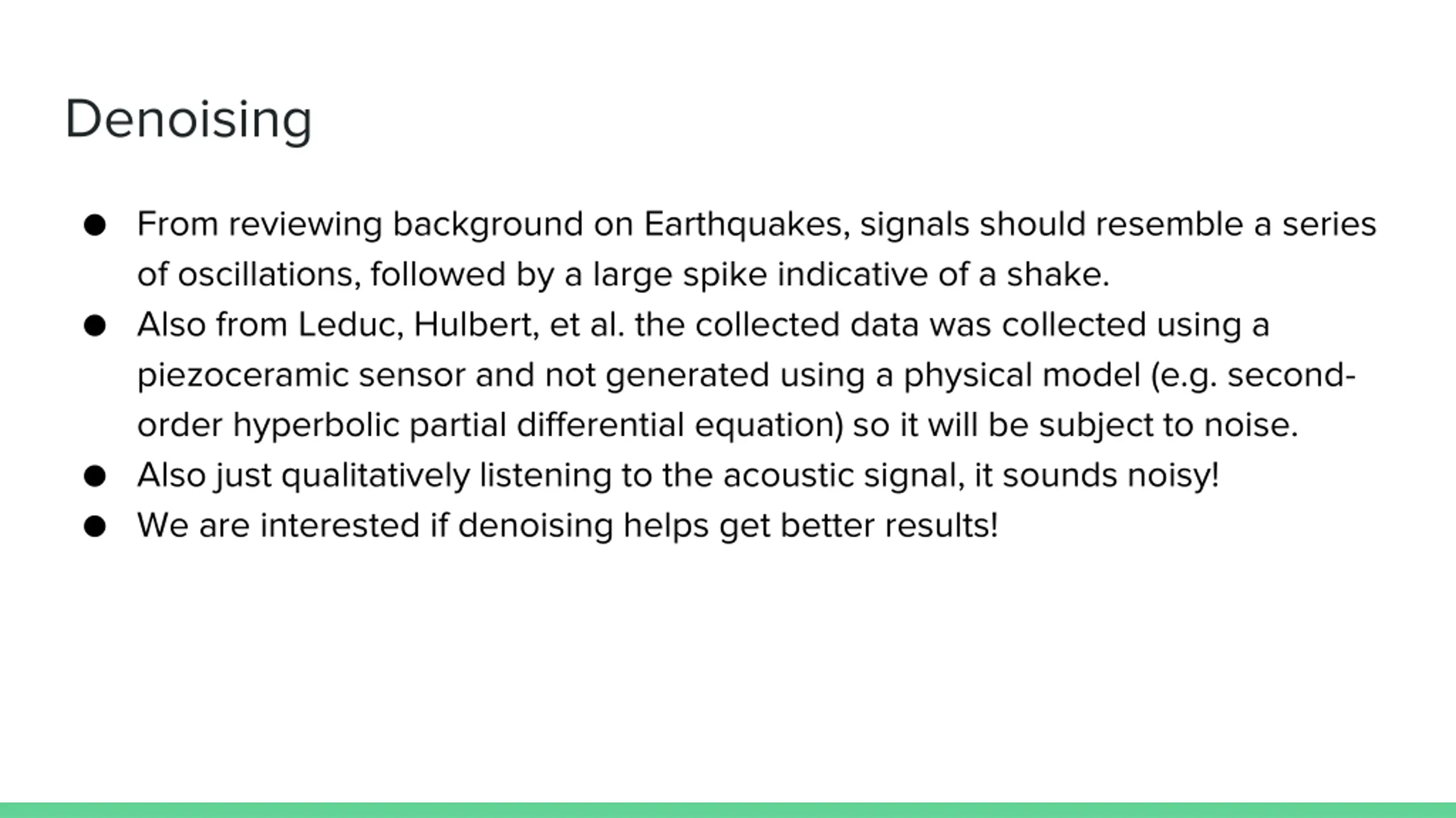 Denoising From reviewing background on Earthquakes, signals should resemble a series of oscillations, followed by a large spike indicative of a shake. Also from Leduc, Hulbert, et al. the collected data was collected using a piezoceramic sensor and not generated using a physical model (e.g. second- order hyperbolic partial differential equation) so it will be subject to noise. Also just qualitatively listening to the acoustic signal, it sounds noisy! We are interested if denoising helps get better results!