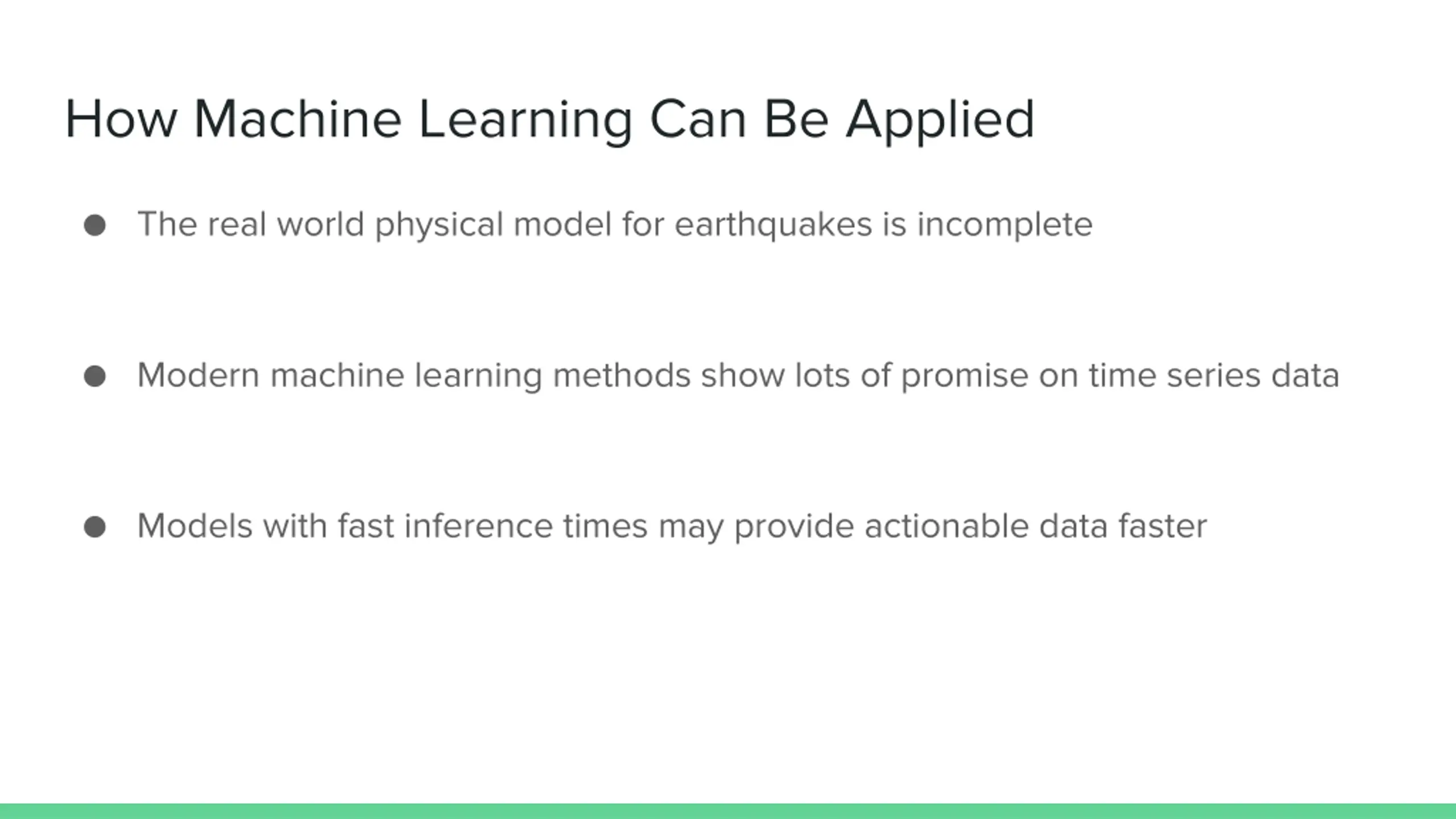 How Machine Learning Can Be Applied The real world physical model for earthquakes is incomplete Modern machine learning methods show lots of promise on time series data Models with fast inference times may provide actionable data faster