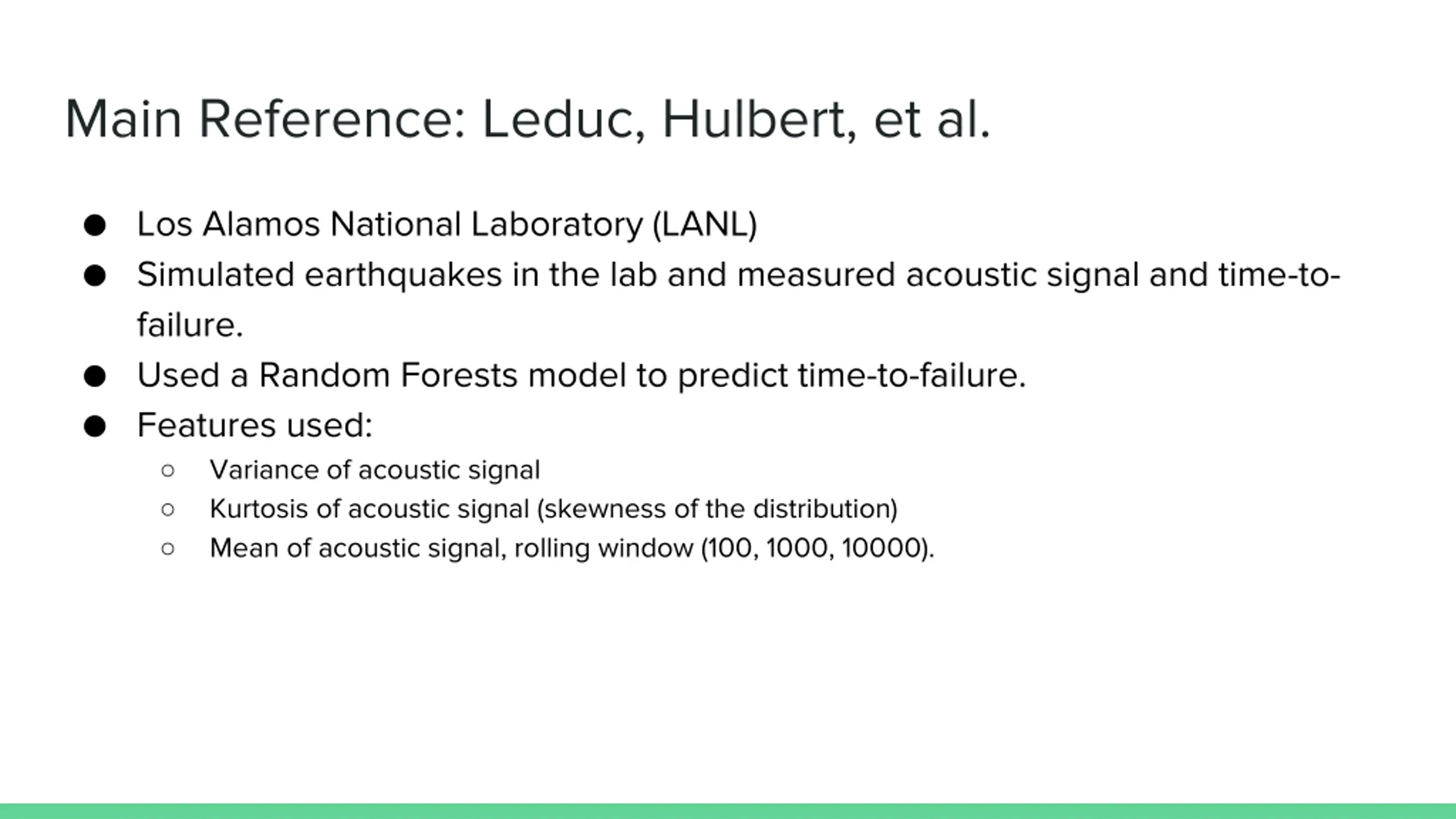Main Reference: Leduc, Hulbert, et al. Los Alamos National Laboratory (LANL) Simulated earthquakes in the lab and measured acoustic signal and time-to- failure. Used a Random Forests model to predict time-to-failure. Features used: Variance of acoustic signal Kurtosis of acoustic signal (skewness of the distribution) Mean of acoustic signal, rolling window (100, 1000, 10000).