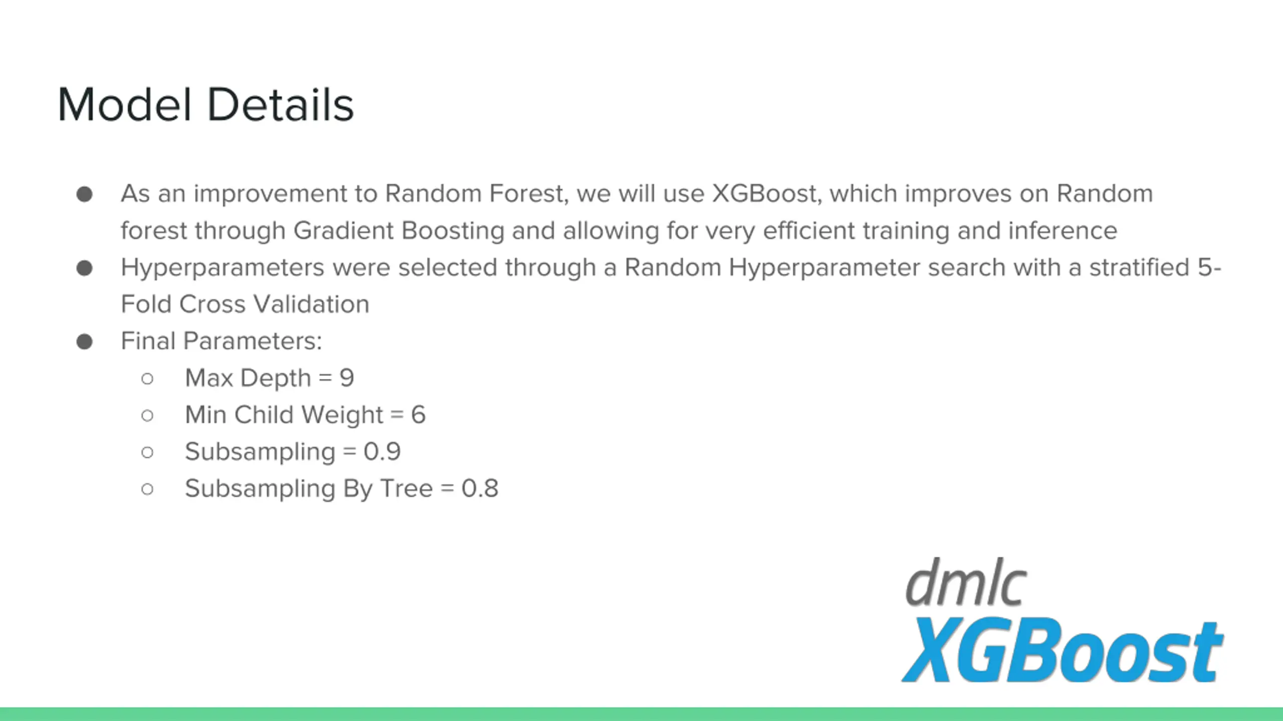 Model Details As an improvement to Random Forest, we will use XGBoost, which improves on Random forest through Gradient Boosting and allowing for very efficient training and inference Hyperparameters were selected through a Random Hyperparameter search with a stratified 5- Fold Cross Validation Final Parameters: Max Depth = 9 Min Child Weight = 6 Subsampling = 0.9 Subsampling By Tree = 0.8