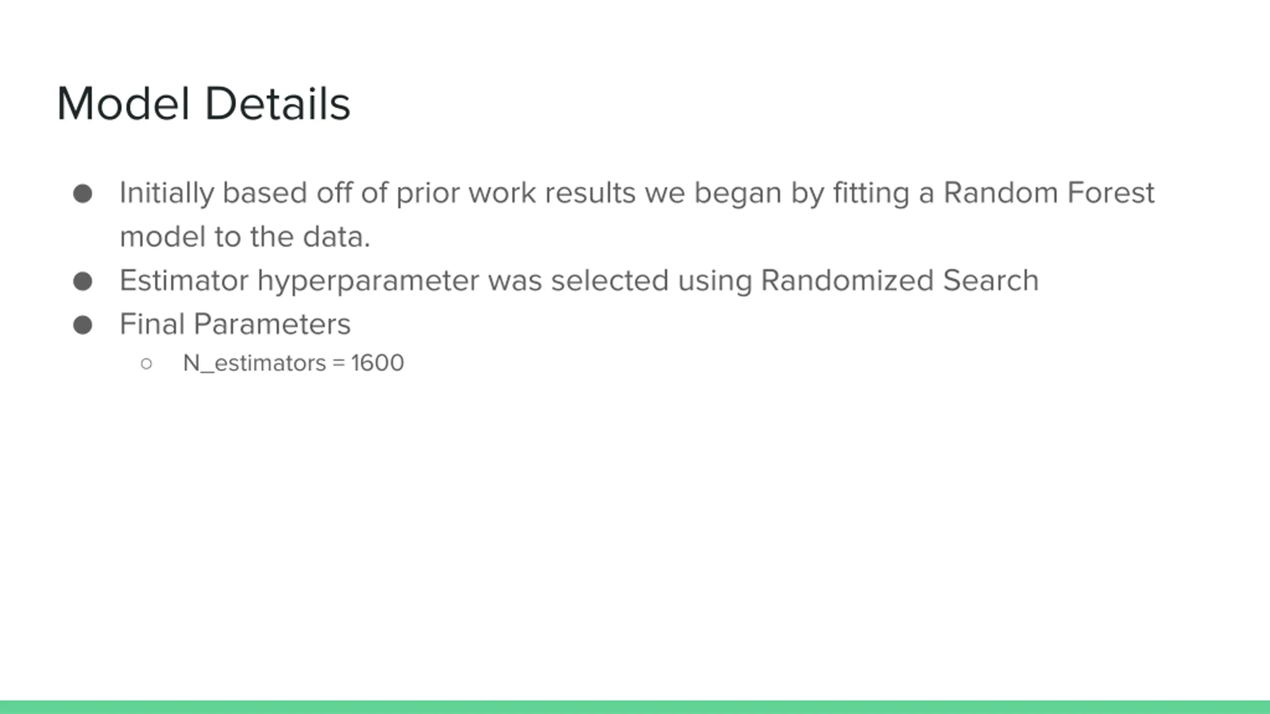 Model Details Initially based off of prior work results we began by fitting a Random Forest model to the data. Estimator hyperparameter was selected using Randomized Search Final Parameters N_estimators = 1600