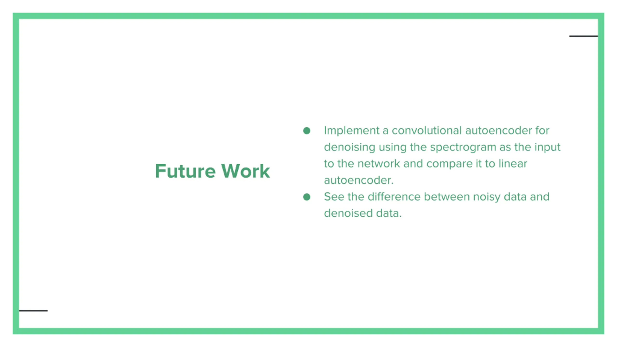 Implement a convolutional autoencoder for denoising using the spectrogram as the input to the network and compare it to linear autoencoder. See the difference between noisy data and denoised data. Future Work