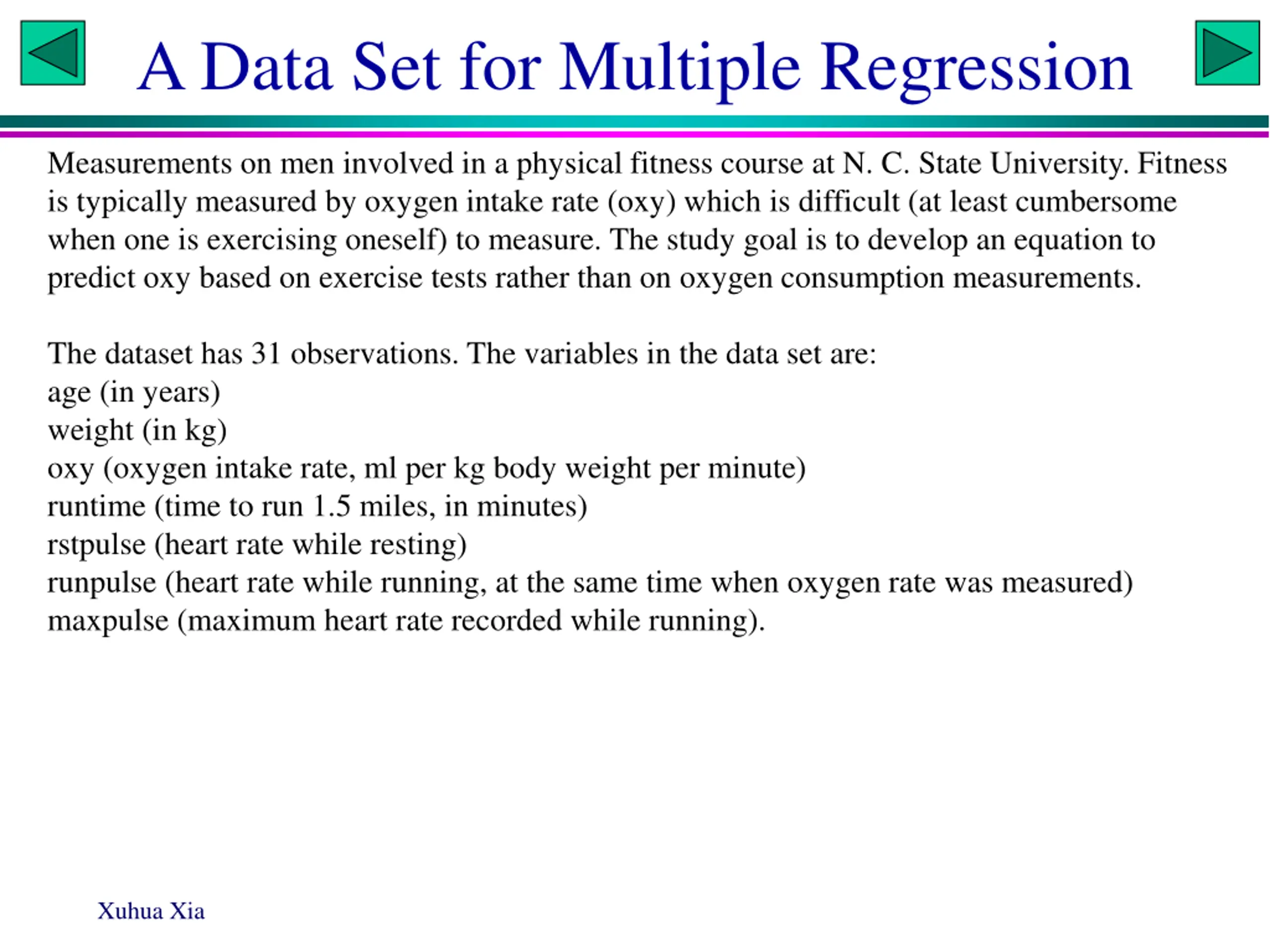 A Data Set for Multiple Regression Measurements on men involved in a physical fitness course at N. C. State University. Fitness is typically measured by oxygen intake rate (oxy) which is difficult (at least cumbersome when one is exercising oneself) to measure. The study goal is to develop an equation to predict oxy based on exercise tests rather than on oxygen consumption measurements. The dataset has 31 observations. The variables in the data set are: age (in years) weight (in kg) oxy (oxygen intake rate, ml per kg body weight per minute) runtime (time to run 1.5 miles, in minutes) rstpulse (heart rate while resting) runpulse (heart rate while running, at the same time when oxygen rate was measured) maxpulse (maximum heart rate recorded while running). Xuhua Xia