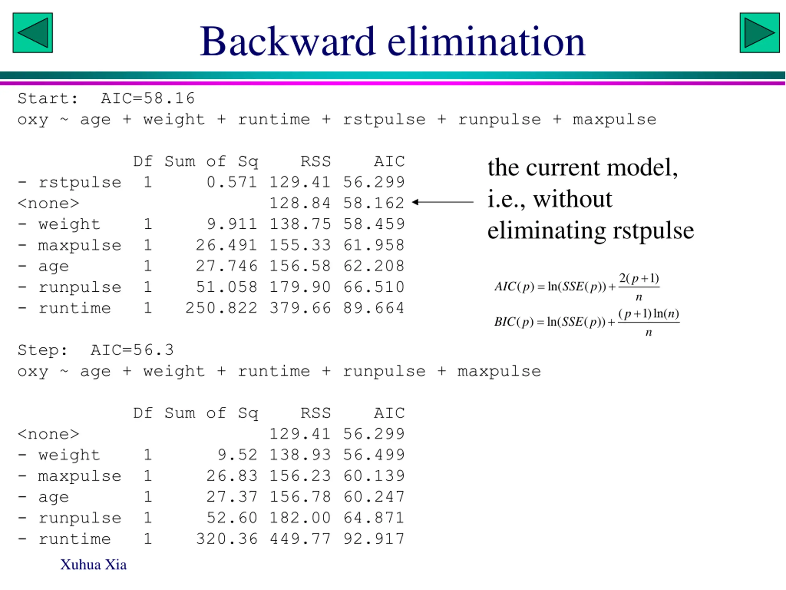 Backward elimination Start: AIC=58.16 oxy ~ age + weight + runtime + rstpulse + runpulse + maxpulse the current model, i.e., without eliminating rstpulse Df Sum of Sq RSS AIC - rstpulse 1 0.571 129.41 56.299 <none> 128.84 58.162 - weight 1 9.911 138.75 58.459 - maxpulse 1 26.491 155.33 61.958 - age 1 27.746 156.58 62.208 - runpulse 1 51.058 179.90 66.510 - runtime 1 250.822 379.66 89.664 + 2( 1) p = + ( ) ln( ( )) AIC p SSE p n + ( 1)ln( ) n p n = + ( ) ln( ( )) BIC p SSE p Step: AIC=56.3 oxy ~ age + weight + runtime + runpulse + maxpulse Df Sum of Sq RSS AIC <none> 129.41 56.299 - weight 1 9.52 138.93 56.499 - maxpulse 1 26.83 156.23 60.139 - age 1 27.37 156.78 60.247 - runpulse 1 52.60 182.00 64.871 - runtime 1 320.36 449.77 92.917 Xuhua Xia
