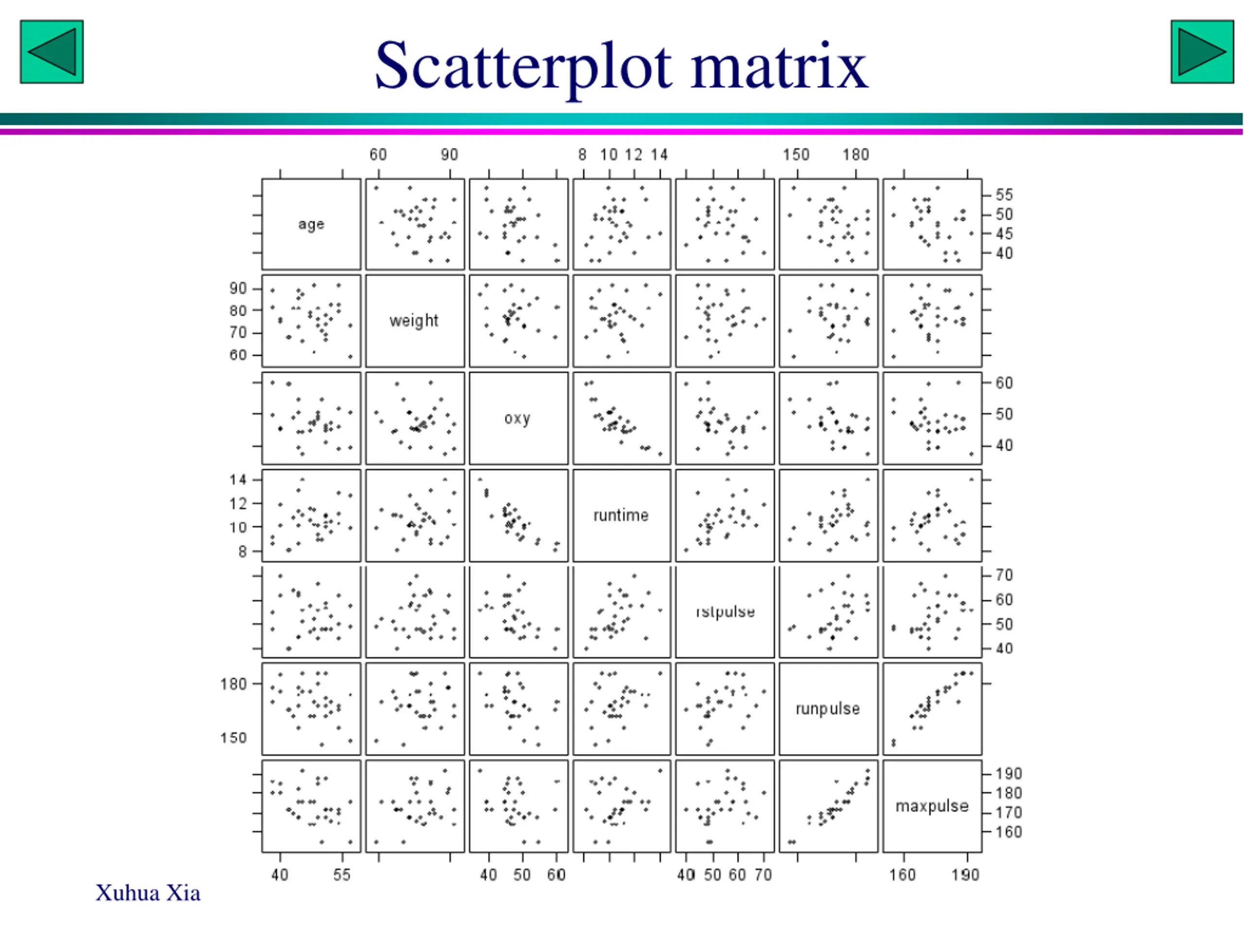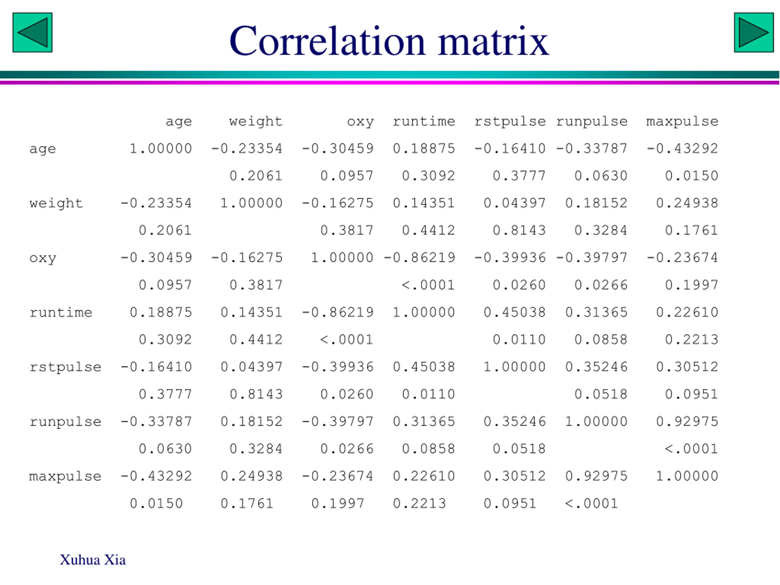 Correlation matrix age weight oxy runtime rstpulse runpulse maxpulse age 1.00000 -0.23354 -0.30459 0.18875 -0.16410 -0.33787 -0.43292 0.2061 0.0957 0.3092 0.3777 0.0630 0.0150 weight -0.23354 1.00000 -0.16275 0.14351 0.04397 0.18152 0.24938 0.2061 0.3817 0.4412 0.8143 0.3284 0.1761 oxy -0.30459 -0.16275 1.00000 -0.86219 -0.39936 -0.39797 -0.23674 0.0957 0.3817 <.0001 0.0260 0.0266 0.1997 runtime 0.18875 0.14351 -0.86219 1.00000 0.45038 0.31365 0.22610 0.3092 0.4412 <.0001 0.0110 0.0858 0.2213 rstpulse -0.16410 0.04397 -0.39936 0.45038 1.00000 0.35246 0.30512 0.3777 0.8143 0.0260 0.0110 0.0518 0.0951 runpulse -0.33787 0.18152 -0.39797 0.31365 0.35246 1.00000 0.92975 0.0630 0.3284 0.0266 0.0858 0.0518 <.0001 maxpulse -0.43292 0.24938 -0.23674 0.22610 0.30512 0.92975 1.00000 0.0150 0.1761 0.1997 0.2213 0.0951 <.0001 Xuhua Xia