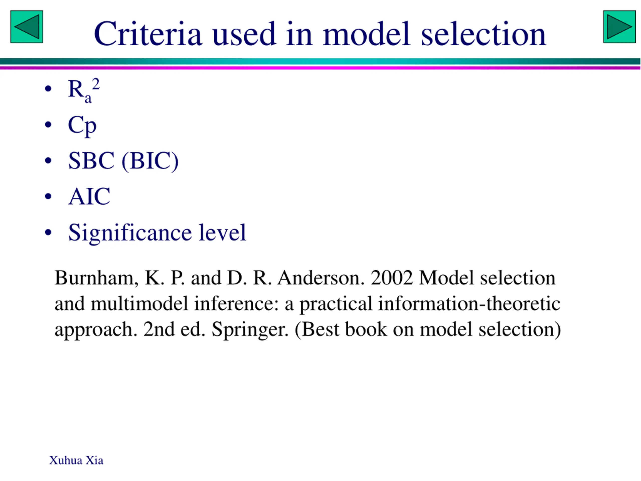Criteria used in model selection 1 n Ra2 Cp SBC (BIC) AIC Significance level 2 2 = 1 1 ( 1 ) Ra R n m Burnham, K. P. and D. R. Anderson. 2002 Model selection and multimodel inference: a practical information-theoretic approach. 2nd ed. Springer. (Best book on model selection) Xuhua Xia