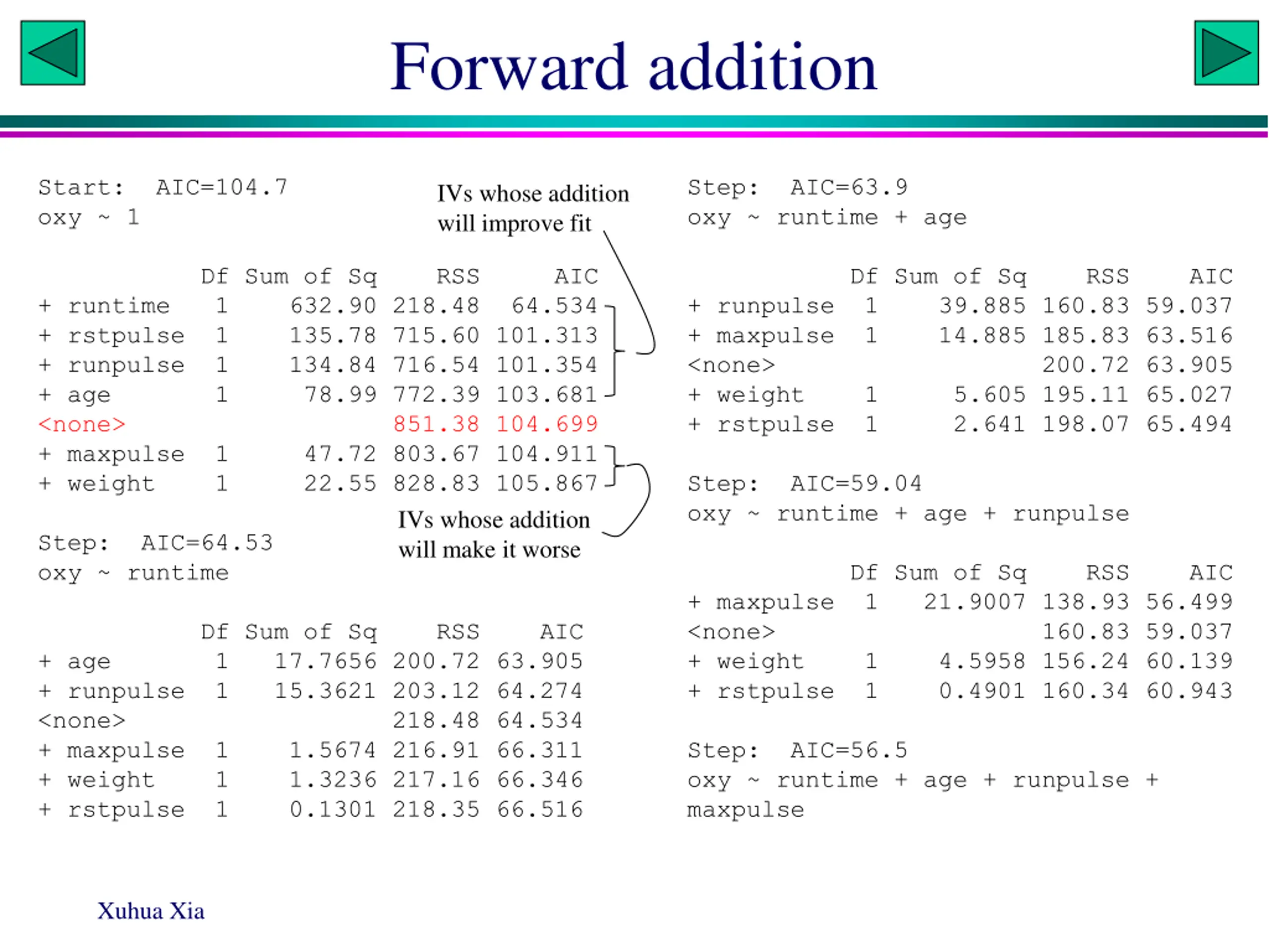 Forward addition Start: AIC=104.7 oxy ~ 1 Step: AIC=63.9 oxy ~ runtime + age IVs whose addition will improve fit Df Sum of Sq RSS AIC + runtime 1 632.90 218.48 64.534 + rstpulse 1 135.78 715.60 101.313 + runpulse 1 134.84 716.54 101.354 + age 1 78.99 772.39 103.681 <none> 851.38 104.699 + maxpulse 1 47.72 803.67 104.911 + weight 1 22.55 828.83 105.867 Df Sum of Sq RSS AIC + runpulse 1 39.885 160.83 59.037 + maxpulse 1 14.885 185.83 63.516 <none> 200.72 63.905 + weight 1 5.605 195.11 65.027 + rstpulse 1 2.641 198.07 65.494 Step: AIC=59.04 oxy ~ runtime + age + runpulse IVs whose addition will make it worse Step: AIC=64.53 oxy ~ runtime Df Sum of Sq RSS AIC + maxpulse 1 21.9007 138.93 56.499 <none> 160.83 59.037 + weight 1 4.5958 156.24 60.139 + rstpulse 1 0.4901 160.34 60.943 Df Sum of Sq RSS AIC + age 1 17.7656 200.72 63.905 + runpulse 1 15.3621 203.12 64.274 <none> 218.48 64.534 + maxpulse 1 1.5674 216.91 66.311 + weight 1 1.3236 217.16 66.346 + rstpulse 1 0.1301 218.35 66.516 Step: AIC=56.5 oxy ~ runtime + age + runpulse + maxpulse Xuhua Xia