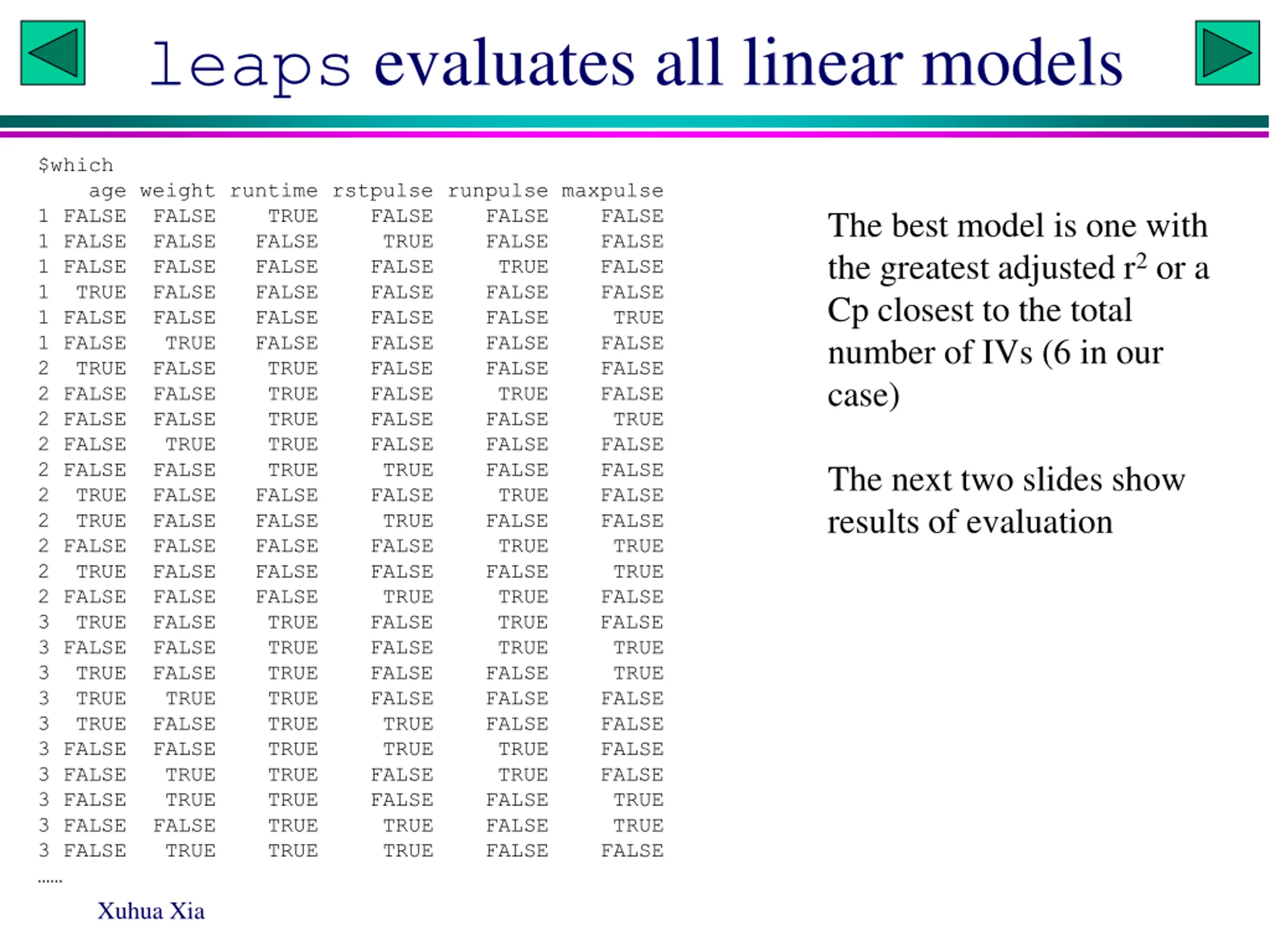 leaps evaluates all linear models $which age weight runtime rstpulse runpulse maxpulse 1 FALSE FALSE TRUE FALSE FALSE FALSE 1 FALSE FALSE FALSE TRUE FALSE FALSE 1 FALSE FALSE FALSE FALSE TRUE FALSE 1 TRUE FALSE FALSE FALSE FALSE FALSE 1 FALSE FALSE FALSE FALSE FALSE TRUE 1 FALSE TRUE FALSE FALSE FALSE FALSE 2 TRUE FALSE TRUE FALSE FALSE FALSE 2 FALSE FALSE TRUE FALSE TRUE FALSE 2 FALSE FALSE TRUE FALSE FALSE TRUE 2 FALSE TRUE TRUE FALSE FALSE FALSE 2 FALSE FALSE TRUE TRUE FALSE FALSE 2 TRUE FALSE FALSE FALSE TRUE FALSE 2 TRUE FALSE FALSE TRUE FALSE FALSE 2 FALSE FALSE FALSE FALSE TRUE TRUE 2 TRUE FALSE FALSE FALSE FALSE TRUE 2 FALSE FALSE FALSE TRUE TRUE FALSE 3 TRUE FALSE TRUE FALSE TRUE FALSE 3 FALSE FALSE TRUE FALSE TRUE TRUE 3 TRUE FALSE TRUE FALSE FALSE TRUE 3 TRUE TRUE TRUE FALSE FALSE FALSE 3 TRUE FALSE TRUE TRUE FALSE FALSE 3 FALSE FALSE TRUE TRUE TRUE FALSE 3 FALSE TRUE TRUE FALSE TRUE FALSE 3 FALSE TRUE TRUE FALSE FALSE TRUE 3 FALSE FALSE TRUE TRUE FALSE TRUE 3 FALSE TRUE TRUE TRUE FALSE FALSE The best model is one with the greatest adjusted r2 or a Cp closest to the total number of IVs (6 in our case) The next two slides show results of evaluation Xuhua Xia