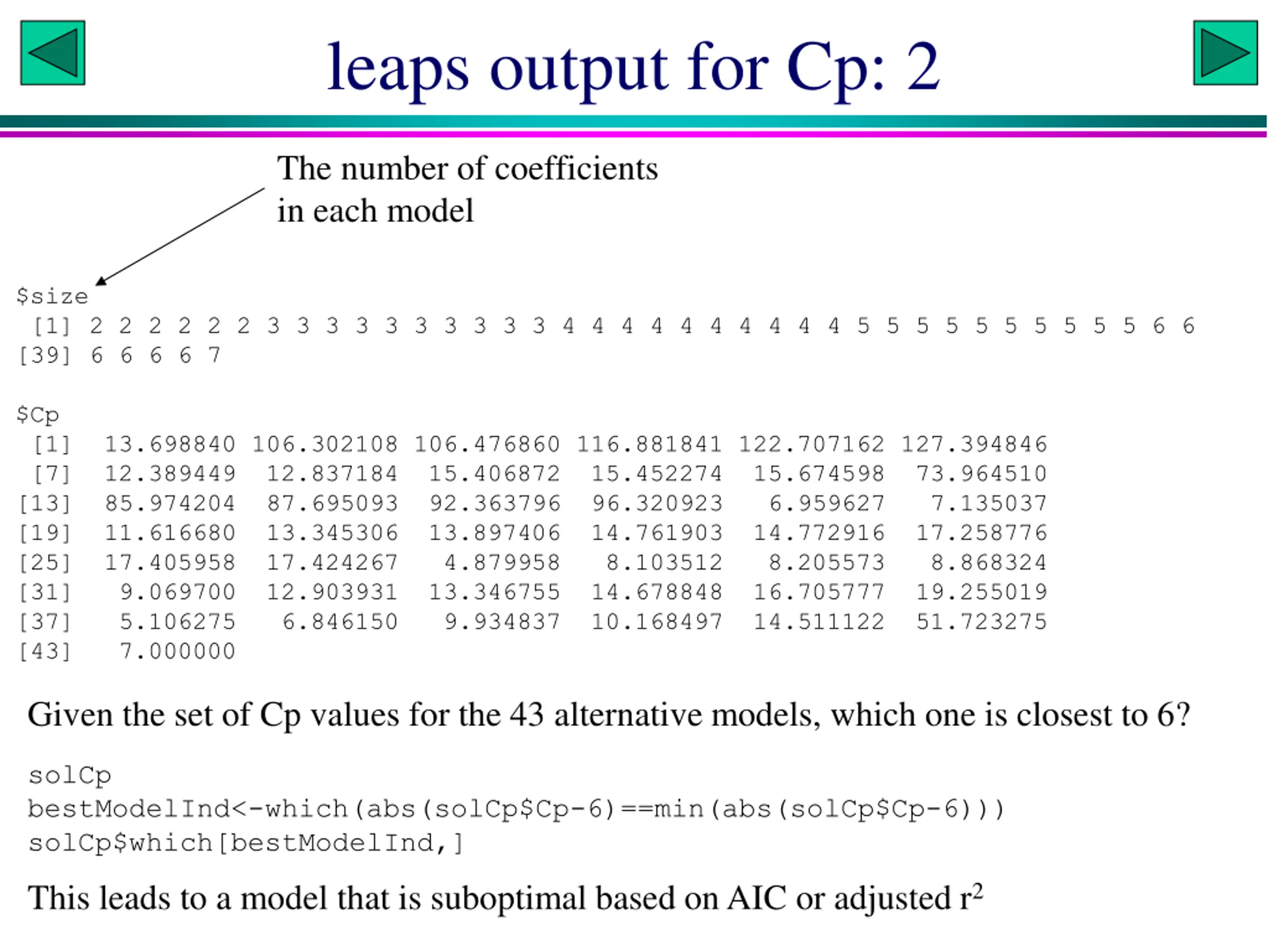 leaps output for Cp: 2 The number of coefficients in each model $size [1] 2 2 2 2 2 2 3 3 3 3 3 3 3 3 3 3 4 4 4 4 4 4 4 4 4 4 5 5 5 5 5 5 5 5 5 5 6 6 [39] 6 6 6 6 7 $Cp [1] 13.698840 106.302108 106.476860 116.881841 122.707162 127.394846 [7] 12.389449 12.837184 15.406872 15.452274 15.674598 73.964510 [13] 85.974204 87.695093 92.363796 96.320923 6.959627 7.135037 [19] 11.616680 13.345306 13.897406 14.761903 14.772916 17.258776 [25] 17.405958 17.424267 4.879958 8.103512 8.205573 8.868324 [31] 9.069700 12.903931 13.346755 14.678848 16.705777 19.255019 [37] 5.106275 6.846150 9.934837 10.168497 14.511122 51.723275 [43] 7.000000 Given the set of Cp values for the 43 alternative models, which one is closest to 6? solCp bestModelInd<-which(abs(solCp$Cp-6)==min(abs(solCp$Cp-6))) solCp$which[bestModelInd,] This leads to a model that is suboptimal based on AIC or adjusted r2