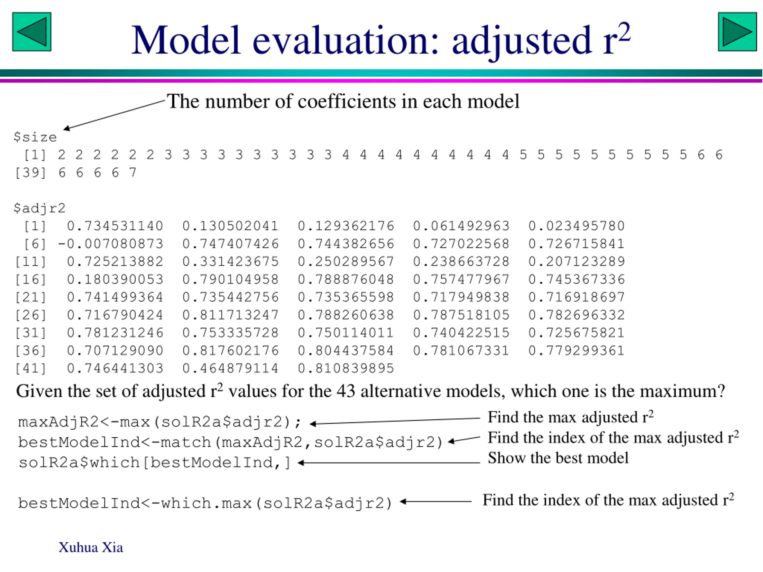 Model evaluation: adjusted r2 The number of coefficients in each model $size [1] 2 2 2 2 2 2 3 3 3 3 3 3 3 3 3 3 4 4 4 4 4 4 4 4 4 4 5 5 5 5 5 5 5 5 5 5 6 6 [39] 6 6 6 6 7 $adjr2 [1] 0.734531140 0.130502041 0.129362176 0.061492963 0.023495780 [6] -0.007080873 0.747407426 0.744382656 0.727022568 0.726715841 [11] 0.725213882 0.331423675 0.250289567 0.238663728 0.207123289 [16] 0.180390053 0.790104958 0.788876048 0.757477967 0.745367336 [21] 0.741499364 0.735442756 0.735365598 0.717949838 0.716918697 [26] 0.716790424 0.811713247 0.788260638 0.787518105 0.782696332 [31] 0.781231246 0.753335728 0.750114011 0.740422515 0.725675821 [36] 0.707129090 0.817602176 0.804437584 0.781067331 0.779299361 [41] 0.746441303 0.464879114 0.810839895 Given the set of adjusted r2 values for the 43 alternative models, which one is the maximum? Find the max adjusted r2 Find the index of the max adjusted r2 Show the best model maxAdjR2<-max(solR2a$adjr2); bestModelInd<-match(maxAdjR2,solR2a$adjr2) solR2a$which[bestModelInd,] Find the index of the max adjusted r2 bestModelInd<-which.max(solR2a$adjr2) Xuhua Xia