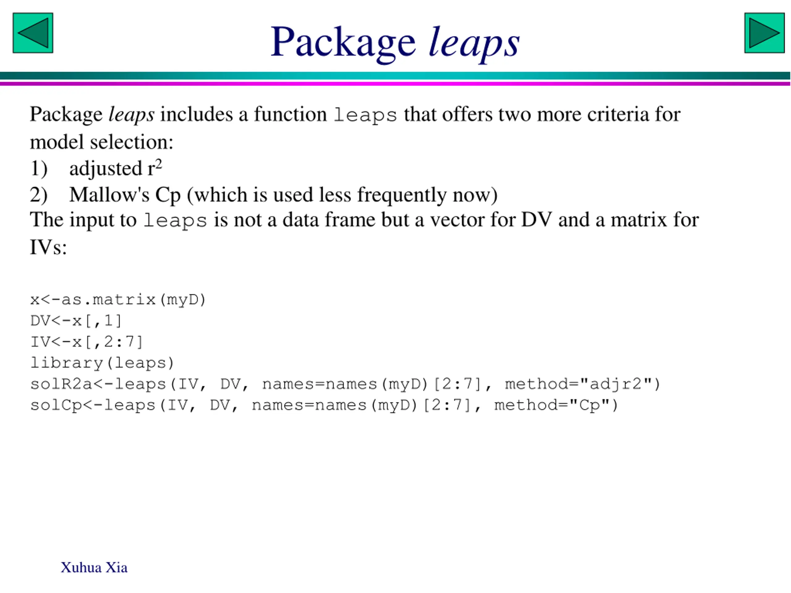 Package leaps Package leaps includes a function leaps that offers two more criteria for model selection: 1) adjusted r2 2) Mallow's Cp (which is used less frequently now) The input to leaps is not a data frame but a vector for DV and a matrix for IVs: x<-as.matrix(myD) DV<-x[,1] IV<-x[,2:7] library(leaps) solR2a<-leaps(IV, DV, names=names(myD)[2:7], method="adjr2") solCp<-leaps(IV, DV, names=names(myD)[2:7], method="Cp") Xuhua Xia
