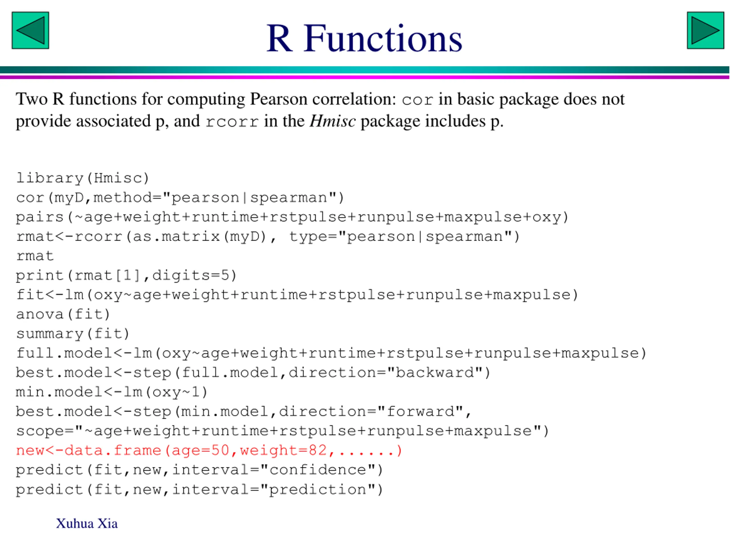 R Functions Two R functions for computing Pearson correlation: cor in basic package does not provide associated p, and rcorr in the Hmisc package includes p. library(Hmisc) cor(myD,method="pearson|spearman") pairs(~age+weight+runtime+rstpulse+runpulse+maxpulse+oxy) rmat<-rcorr(as.matrix(myD), type="pearson|spearman") rmat print(rmat[1],digits=5) fit<-lm(oxy~age+weight+runtime+rstpulse+runpulse+maxpulse) anova(fit) summary(fit) full.model<-lm(oxy~age+weight+runtime+rstpulse+runpulse+maxpulse) best.model<-step(full.model,direction="backward") min.model<-lm(oxy~1) best.model<-step(min.model,direction="forward", scope="~age+weight+runtime+rstpulse+runpulse+maxpulse") new<-data.frame(age=50,weight=82,......) predict(fit,new,interval="confidence") predict(fit,new,interval="prediction") Xuhua Xia
