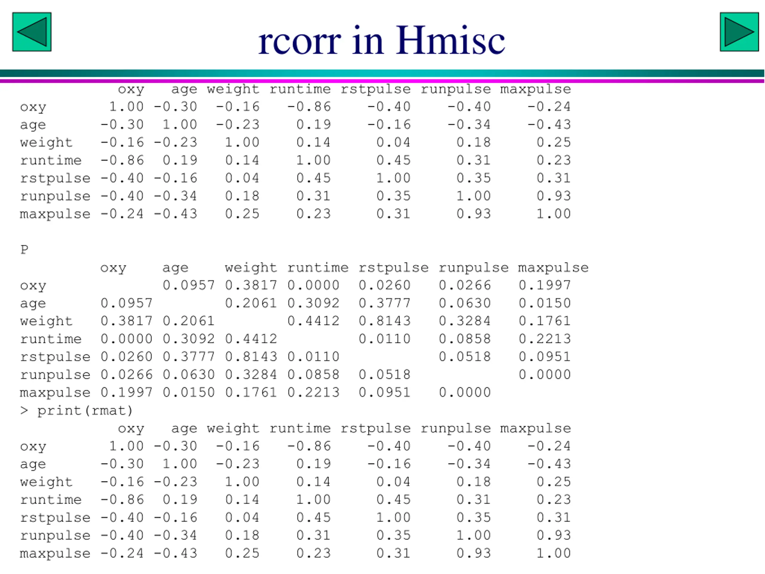 rcorr in Hmisc oxy age weight runtime rstpulse runpulse maxpulse oxy 1.00 -0.30 -0.16 -0.86 -0.40 -0.40 -0.24 age -0.30 1.00 -0.23 0.19 -0.16 -0.34 -0.43 weight -0.16 -0.23 1.00 0.14 0.04 0.18 0.25 runtime -0.86 0.19 0.14 1.00 0.45 0.31 0.23 rstpulse -0.40 -0.16 0.04 0.45 1.00 0.35 0.31 runpulse -0.40 -0.34 0.18 0.31 0.35 1.00 0.93 maxpulse -0.24 -0.43 0.25 0.23 0.31 0.93 1.00 P oxy age weight runtime rstpulse runpulse maxpulse oxy 0.0957 0.3817 0.0000 0.0260 0.0266 0.1997 age 0.0957 0.2061 0.3092 0.3777 0.0630 0.0150 weight 0.3817 0.2061 0.4412 0.8143 0.3284 0.1761 runtime 0.0000 0.3092 0.4412 0.0110 0.0858 0.2213 rstpulse 0.0260 0.3777 0.8143 0.0110 0.0518 0.0951 runpulse 0.0266 0.0630 0.3284 0.0858 0.0518 0.0000 maxpulse 0.1997 0.0150 0.1761 0.2213 0.0951 0.0000 > print(rmat) oxy age weight runtime rstpulse runpulse maxpulse oxy 1.00 -0.30 -0.16 -0.86 -0.40 -0.40 -0.24 age -0.30 1.00 -0.23 0.19 -0.16 -0.34 -0.43 weight -0.16 -0.23 1.00 0.14 0.04 0.18 0.25 runtime -0.86 0.19 0.14 1.00 0.45 0.31 0.23 rstpulse -0.40 -0.16 0.04 0.45 1.00 0.35 0.31 runpulse -0.40 -0.34 0.18 0.31 0.35 1.00 0.93 maxpulse -0.24 -0.43 0.25 0.23 0.31 0.93 1.00