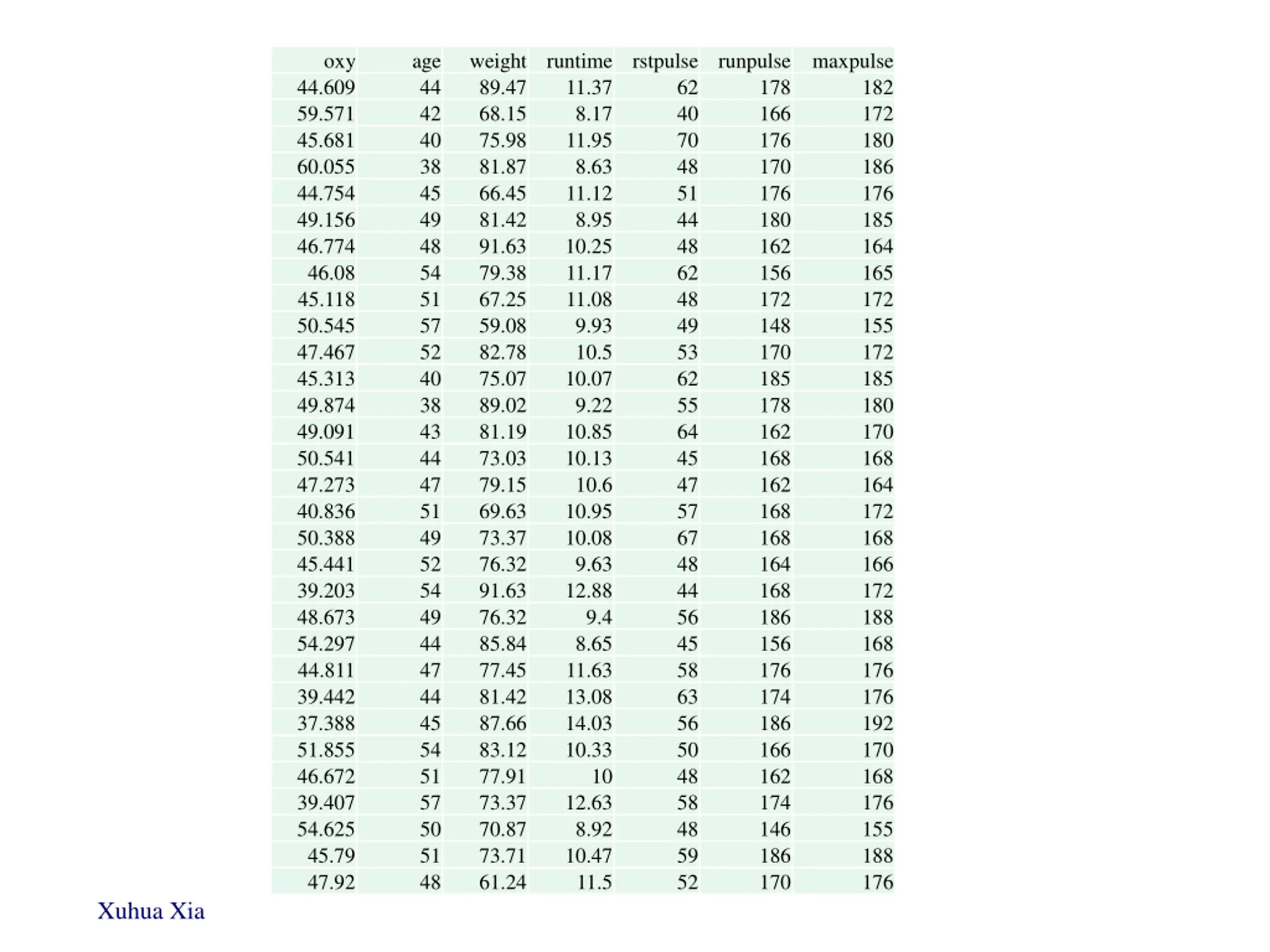 oxy age 44 42 40 38 45 49 48 54 51 57 52 40 38 43 44 47 51 49 52 54 49 44 47 44 45 54 51 57 50 51 48 weight 89.47 68.15 75.98 81.87 66.45 81.42 91.63 79.38 67.25 59.08 82.78 75.07 89.02 81.19 73.03 79.15 69.63 73.37 76.32 91.63 76.32 85.84 77.45 81.42 87.66 83.12 77.91 73.37 70.87 73.71 61.24 runtime 11.37 8.17 11.95 8.63 11.12 8.95 10.25 11.17 11.08 9.93 10.5 10.07 9.22 10.85 10.13 10.6 10.95 10.08 9.63 12.88 rstpulse runpulse maxpulse 44.609 59.571 45.681 60.055 44.754 49.156 46.774 46.08 45.118 50.545 47.467 45.313 49.874 49.091 50.541 47.273 40.836 50.388 45.441 39.203 48.673 54.297 44.811 39.442 37.388 51.855 46.672 39.407 54.625 45.79 47.92 62 40 70 48 51 44 48 62 48 49 53 62 55 64 45 47 57 67 48 44 56 45 58 63 56 50 48 58 48 59 52 178 166 176 170 176 180 162 156 172 148 170 185 178 162 168 162 168 168 164 168 186 156 176 174 186 166 162 174 146 186 170 182 172 180 186 176 185 164 165 172 155 172 185 180 170 168 164 172 168 166 172 188 168 176 176 192 170 168 176 155 188 176 9.4 8.65 11.63 13.08 14.03 10.33 10 12.63 8.92 10.47 11.5 Xuhua Xia