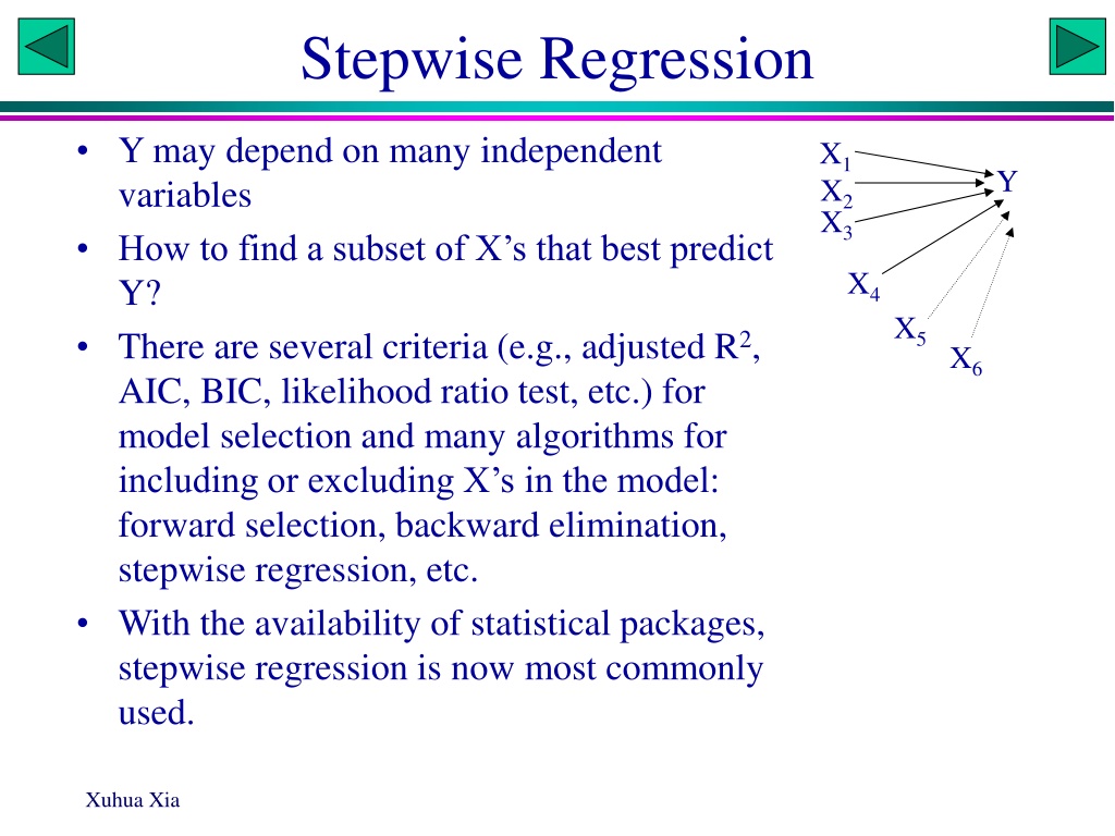 Stepwise Regression Y may depend on many independent variables How to find a subset of X s that best predict Y? There are several criteria (e.g., adjusted R2, AIC, BIC, likelihood ratio test, etc.) for model selection and many algorithms for including or excluding X s in the model: forward selection, backward elimination, stepwise regression, etc. With the availability of statistical packages, stepwise regression is now most commonly used. X1 Y X2 X3 X4 X5 X6 Xuhua Xia