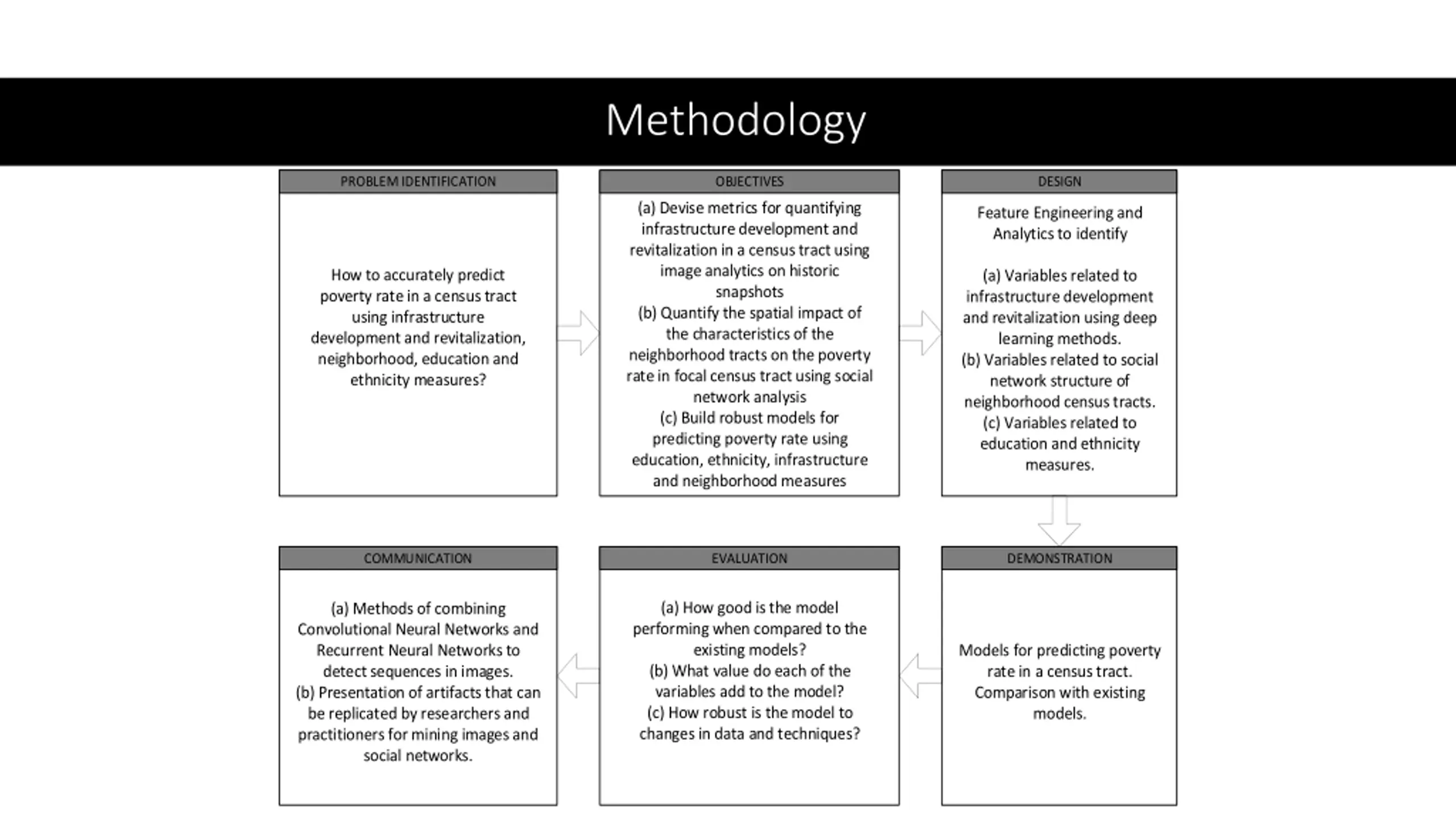 Methodology PROBLEM IDENTIFICATION OBJECTIVES DESIGN (a) Devise metrics for quantifying infrastructure development and revitalization in a census tract using image analytics on historic snapshots (b) Quantify the spatial impact of the characteristics of the neighborhood tracts on the poverty rate in focal census tract using social network analysis (c) Build robust models for predicting poverty rate using education, ethnicity, infrastructure and neighborhood measures Feature Engineering and Analytics to identify How to accurately predict poverty rate in a census tract using infrastructure development and revitalization, neighborhood, education and ethnicity measures? (a) Variables related to infrastructure development and revitalization using deep learning methods. (b) Variables related to social network structure of neighborhood census tracts. (c) Variables related to education and ethnicity measures. COMMUNICATION EVALUATION DEMONSTRATION (a) How good is the model performing when compared to the existing models? (b) What value do each of the variables add to the model? (c) How robust is the model to changes in data and techniques? (a) Methods of combining Convolutional Neural Networks and Recurrent Neural Networks to detect sequences in images. (b) Presentation of artifacts that can be replicated by researchers and practitioners for mining images and social networks. Models for predicting poverty rate in a census tract. Comparison with existing models.
