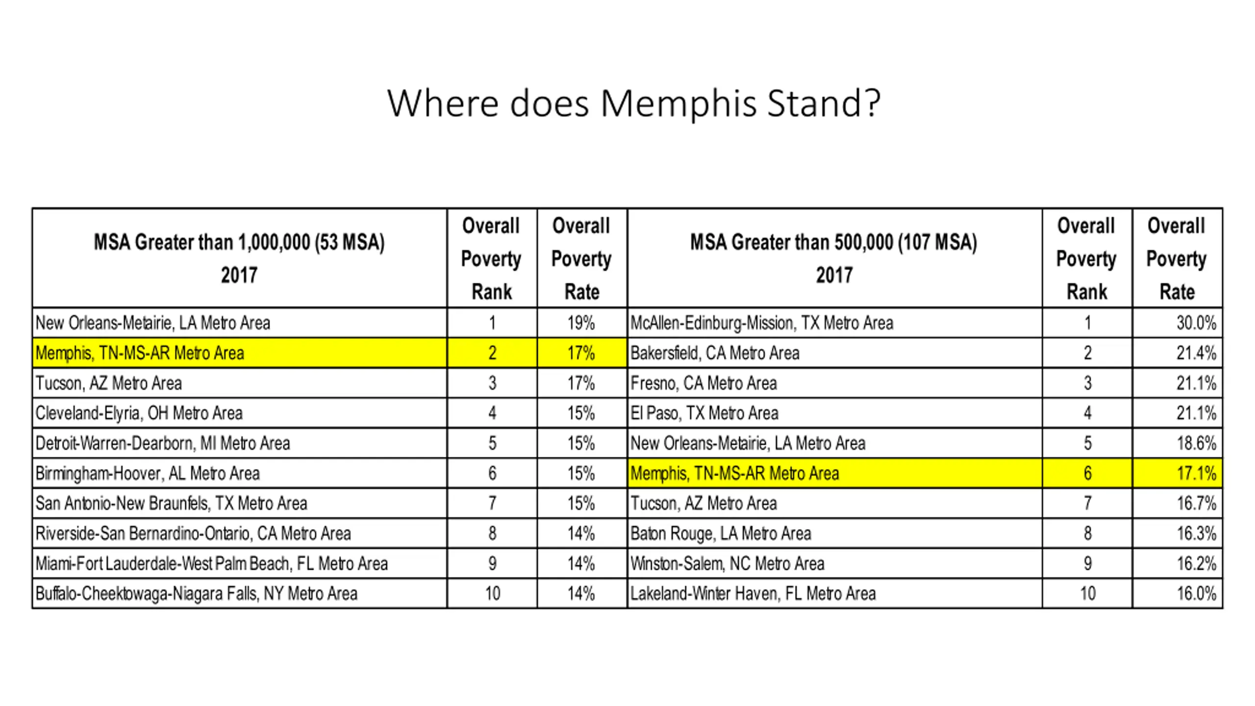 Where does Memphis Stand? Overall Poverty Rank 1 2 3 4 5 6 7 8 9 10 Overall Poverty Rate 19% 17% 17% 15% 15% 15% 15% 14% 14% 14% Overall Poverty Rank 1 2 3 4 5 6 7 8 9 10 Overall Poverty Rate 30.0% 21.4% 21.1% 21.1% 18.6% 17.1% 16.7% 16.3% 16.2% 16.0% MSA Greater than 1,000,000 (53 MSA) 2017 MSA Greater than 500,000 (107 MSA) 2017 New Orleans-Metairie, LA Metro Area Memphis, TN-MS-AR Metro Area Tucson, AZ Metro Area Cleveland-Elyria, OH Metro Area Detroit-Warren-Dearborn, MI Metro Area Birmingham-Hoover, AL Metro Area San Antonio-New Braunfels, TX Metro Area Riverside-San Bernardino-Ontario, CA Metro Area Miami-Fort Lauderdale-West Palm Beach, FL Metro Area Buffalo-Cheektowaga-Niagara Falls, NY Metro Area McAllen-Edinburg-Mission, TX Metro Area Bakersfield, CA Metro Area Fresno, CA Metro Area El Paso, TX Metro Area New Orleans-Metairie, LA Metro Area Memphis, TN-MS-AR Metro Area Tucson, AZ Metro Area Baton Rouge, LA Metro Area Winston-Salem, NC Metro Area Lakeland-Winter Haven, FL Metro Area