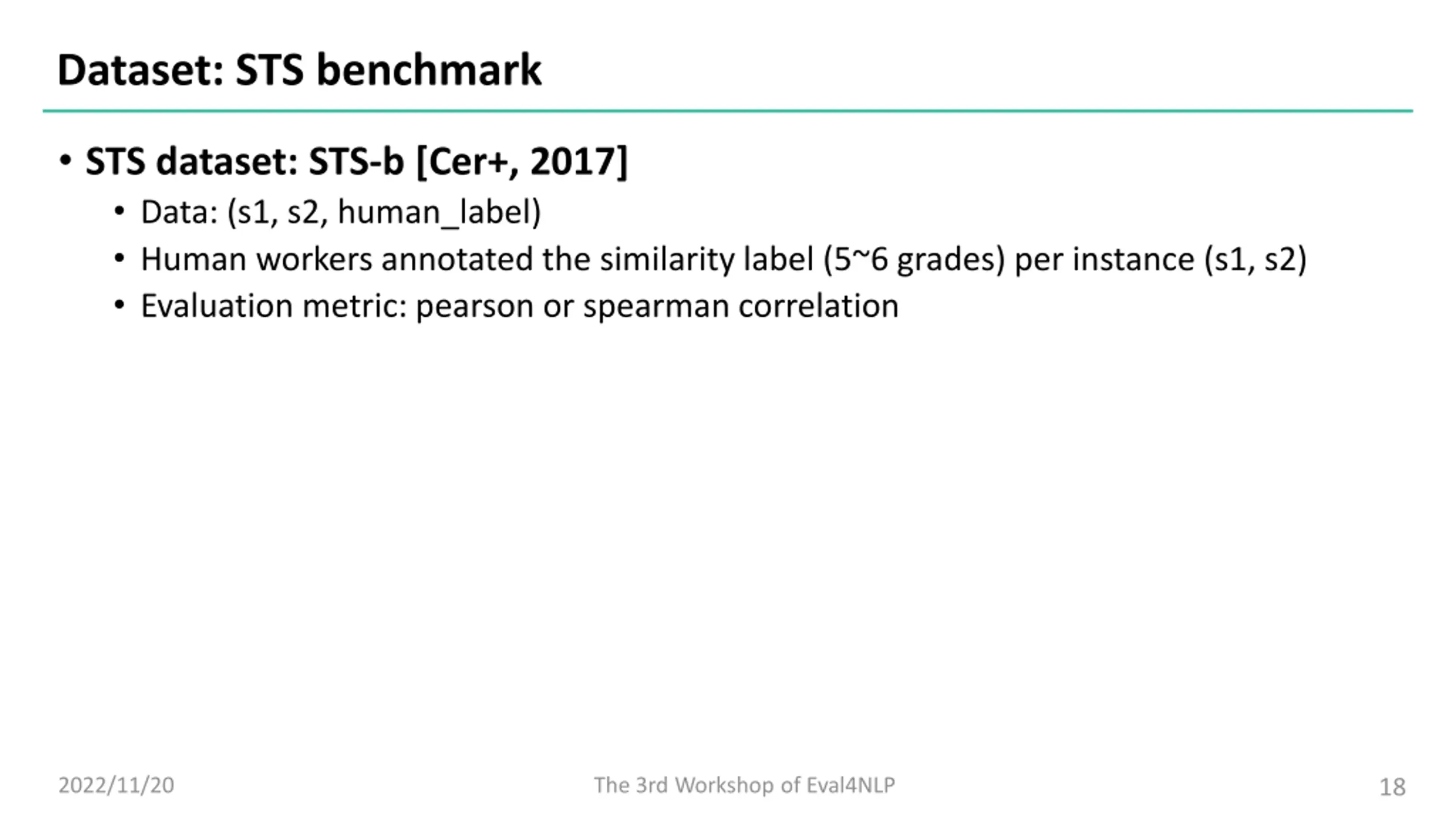 STS is one of the representative benchmark tasks in NLP GLUE: a collection of benchmark dataset in NLP Aims generalization model for dataset size, text genres, degrees of difficulty Semantic Textual Similarity (STS) is one of GLUE tasks https://gluebenchmark.com/ 2022/11/20 The 3rd Workshop of Eval4NLP 21