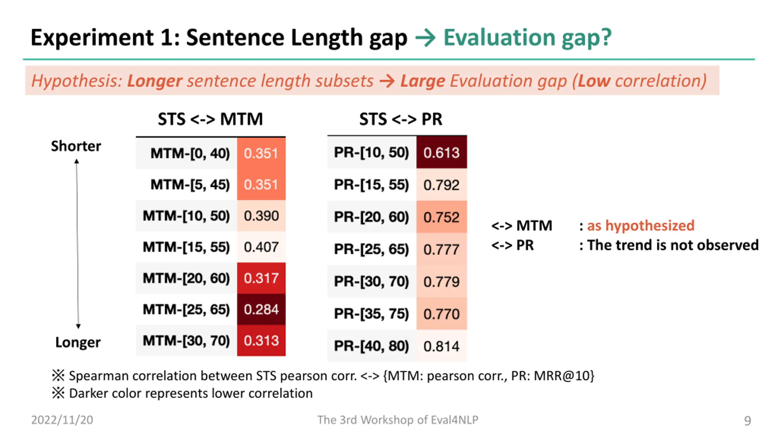 Experiment 1: Sentence Length gap Evaluation gap? Hypothesis: Longer sentence length subsets Large Evaluation gap We made subsets according to the STS sentence length distribution MTM-[x, y) : examples of sentence length [x, y) in MTM dataset PR-[x, y) : in PR dataset PR-[x, y) MTM-[x, y) 2022/11/20 The 3rd Workshop of Eval4NLP 8