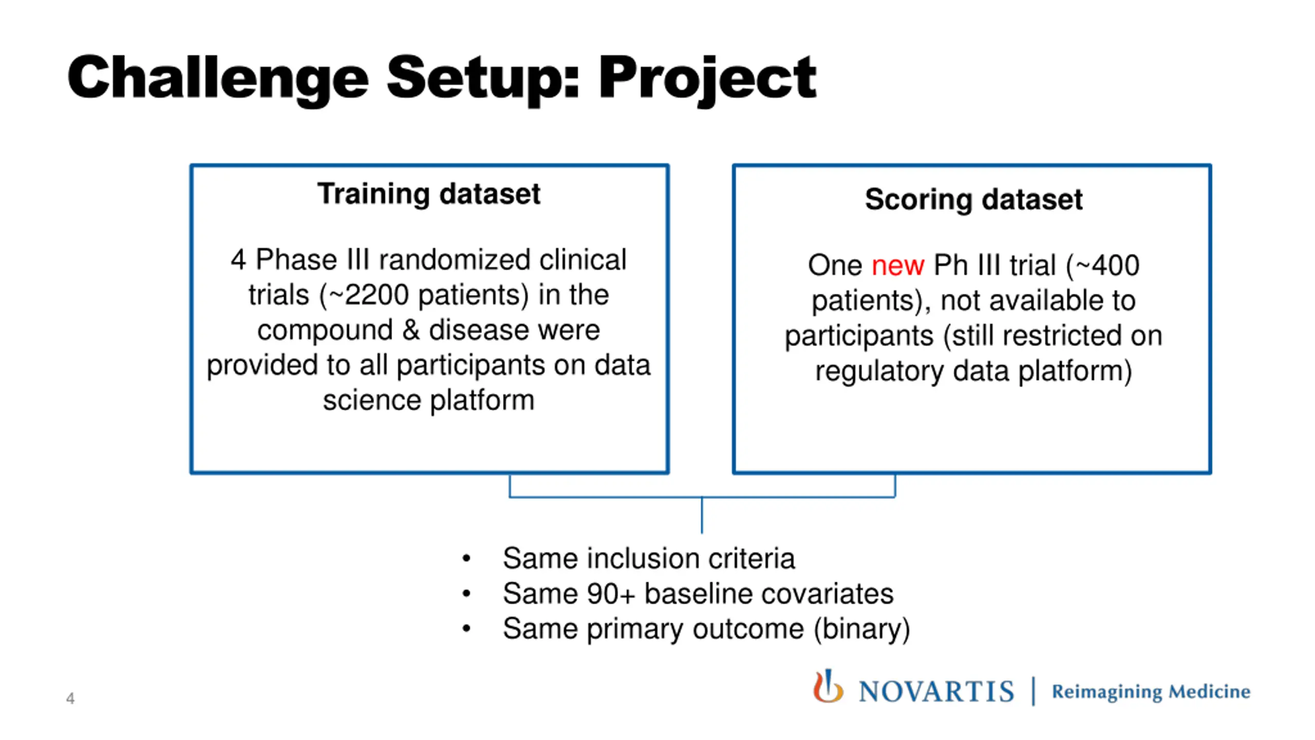 Challenge Setup: Project Training dataset Scoring dataset 4 Phase III randomized clinical trials (~2200 patients) in the compound & disease were provided to all participants on data science platform One new Ph III trial (~400 patients), not available to participants (still restricted on regulatory data platform) Same inclusion criteria Same 90+ baseline covariates Same primary outcome (binary) 4