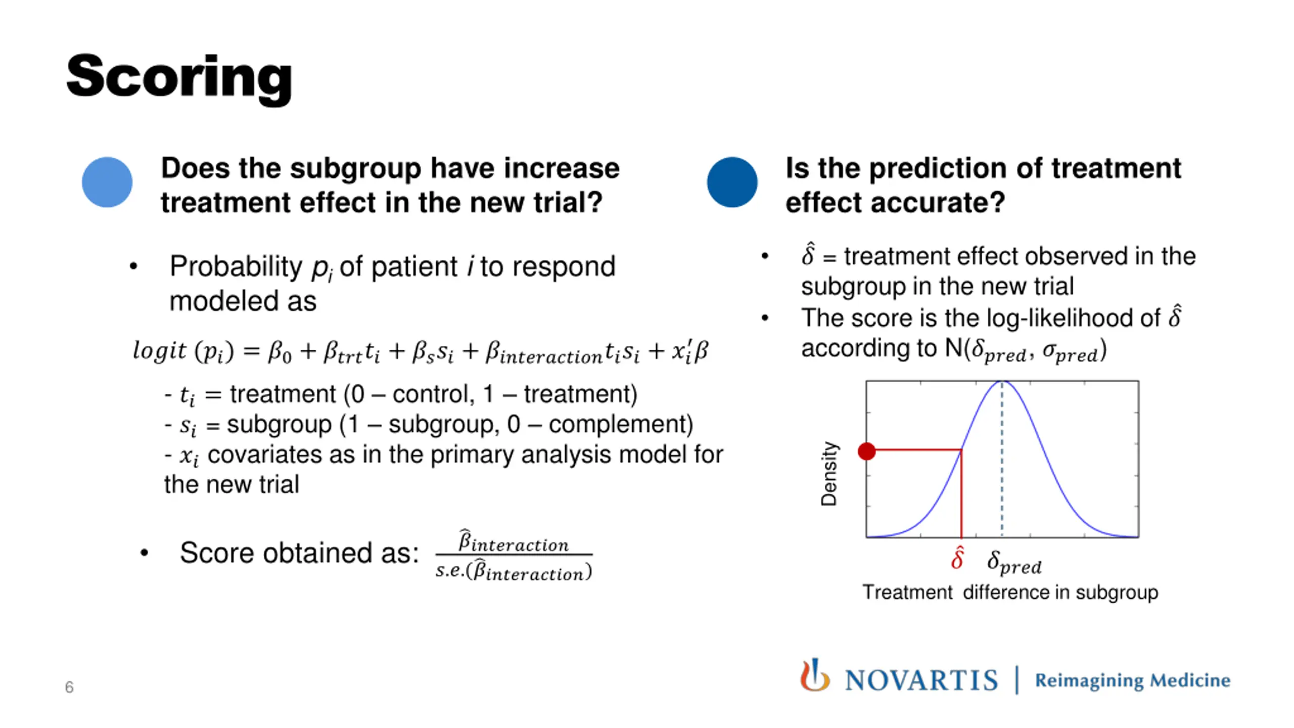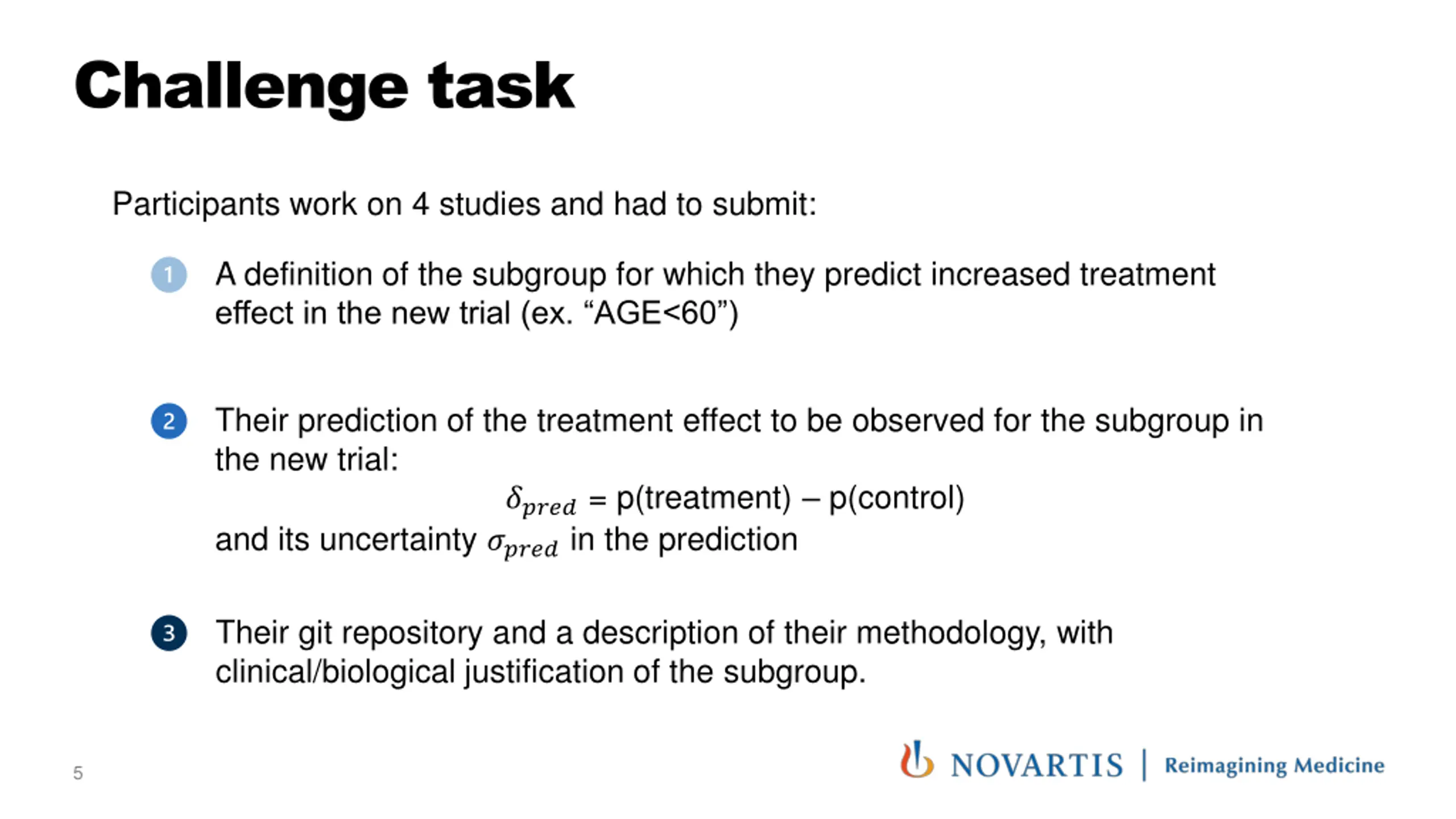 Challenge task Participants work on 4 studies and had to submit: A definition of the subgroup for which they predict increased treatment effect in the new trial (ex. AGE<60 ) Their prediction of the treatment effect to be observed for the subgroup in the new trial: ????? = p(treatment) p(control) and its uncertainty ????? in the prediction Their git repository and a description of their methodology, with clinical/biological justification of the subgroup. 5