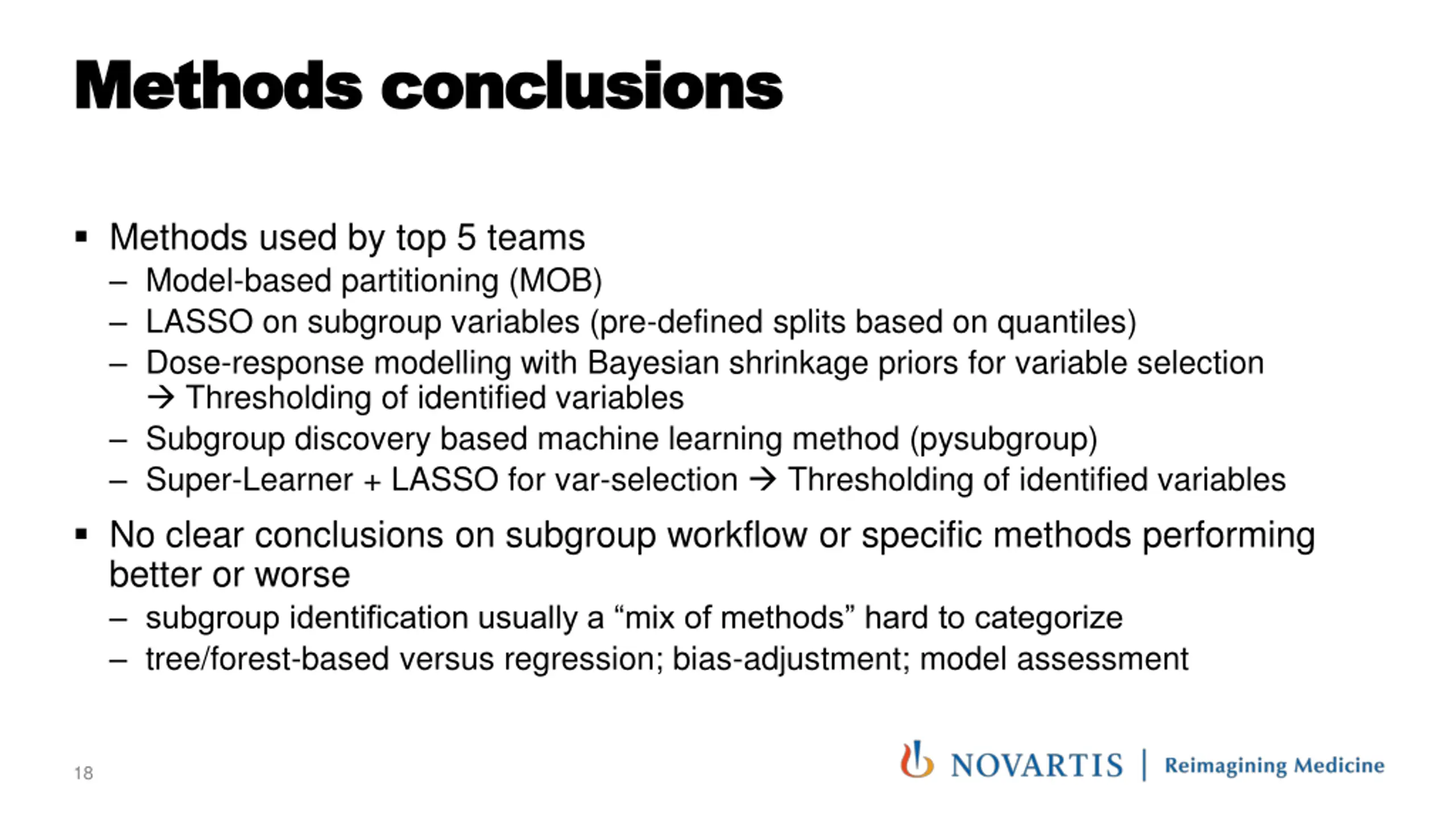 Methods conclusions Methods conclusions Methods used by top 5 teams Model-based partitioning (MOB) LASSO on subgroup variables (pre-defined splits based on quantiles) Dose-response modelling with Bayesian shrinkage priors for variable selection Thresholding of identified variables Subgroup discovery based machine learning method (pysubgroup) Super-Learner + LASSO for var-selection Thresholding of identified variables No clear conclusions on subgroup workflow or specific methods performing better or worse subgroup identification usually a mix of methods hard to categorize tree/forest-based versus regression; bias-adjustment; model assessment 18