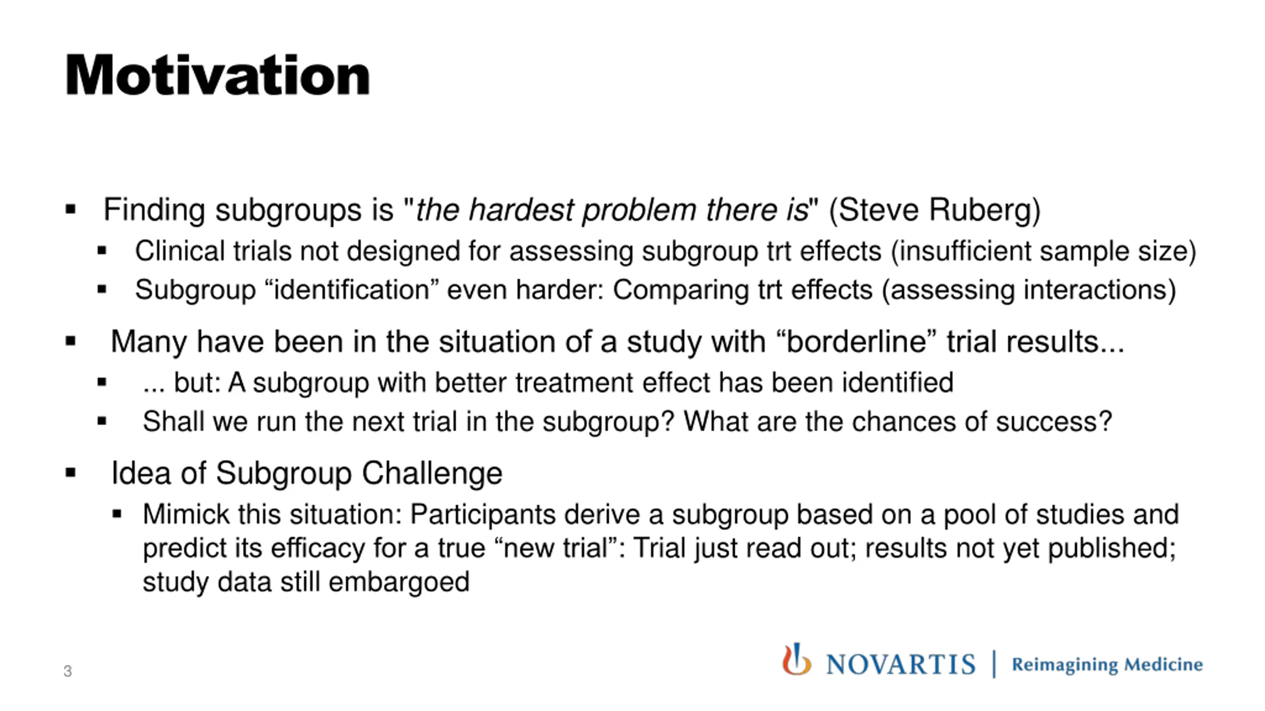 Motivation Finding subgroups is "the hardest problem there is" (Steve Ruberg) Clinical trials not designed for assessing subgroup trt effects (insufficient sample size) Subgroup identification even harder: Comparing trt effects (assessing interactions) Many have been in the situation of a study with borderline trial results... ... but: A subgroup with better treatment effect has been identified Shall we run the next trial in the subgroup? What are the chances of success? Idea of Subgroup Challenge Mimick this situation: Participants derive a subgroup based on a pool of studies and predict its efficacy for a true new trial : Trial just read out; results not yet published; study data still embargoed 3