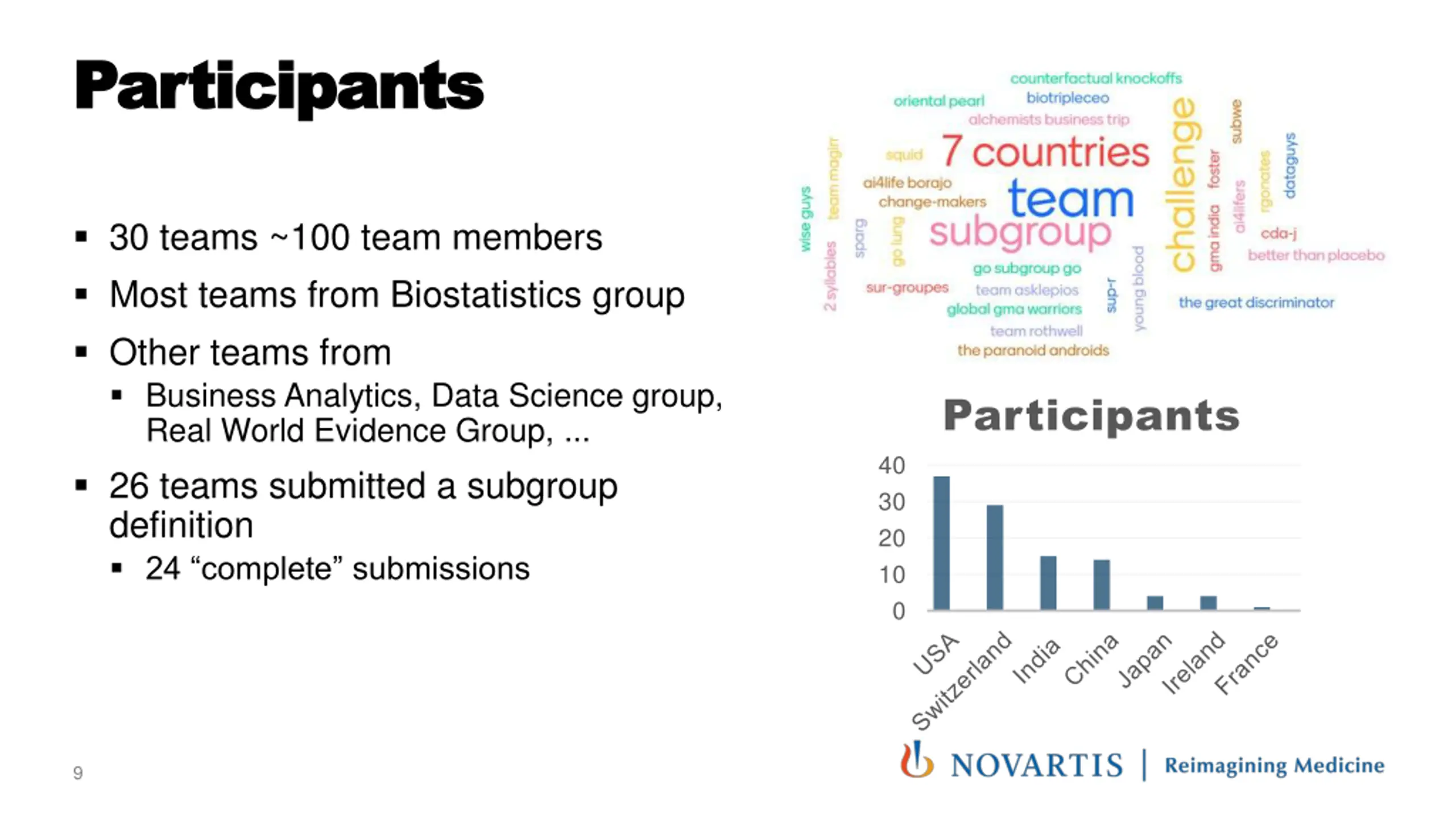 Participants Participants 30 teams ~100 team members Most teams from Biostatistics group Other teams from Business Analytics, Data Science group, Real World Evidence Group, ... 26 teams submitted a subgroup definition 24 complete submissions Participants 40 30 20 10 0 9