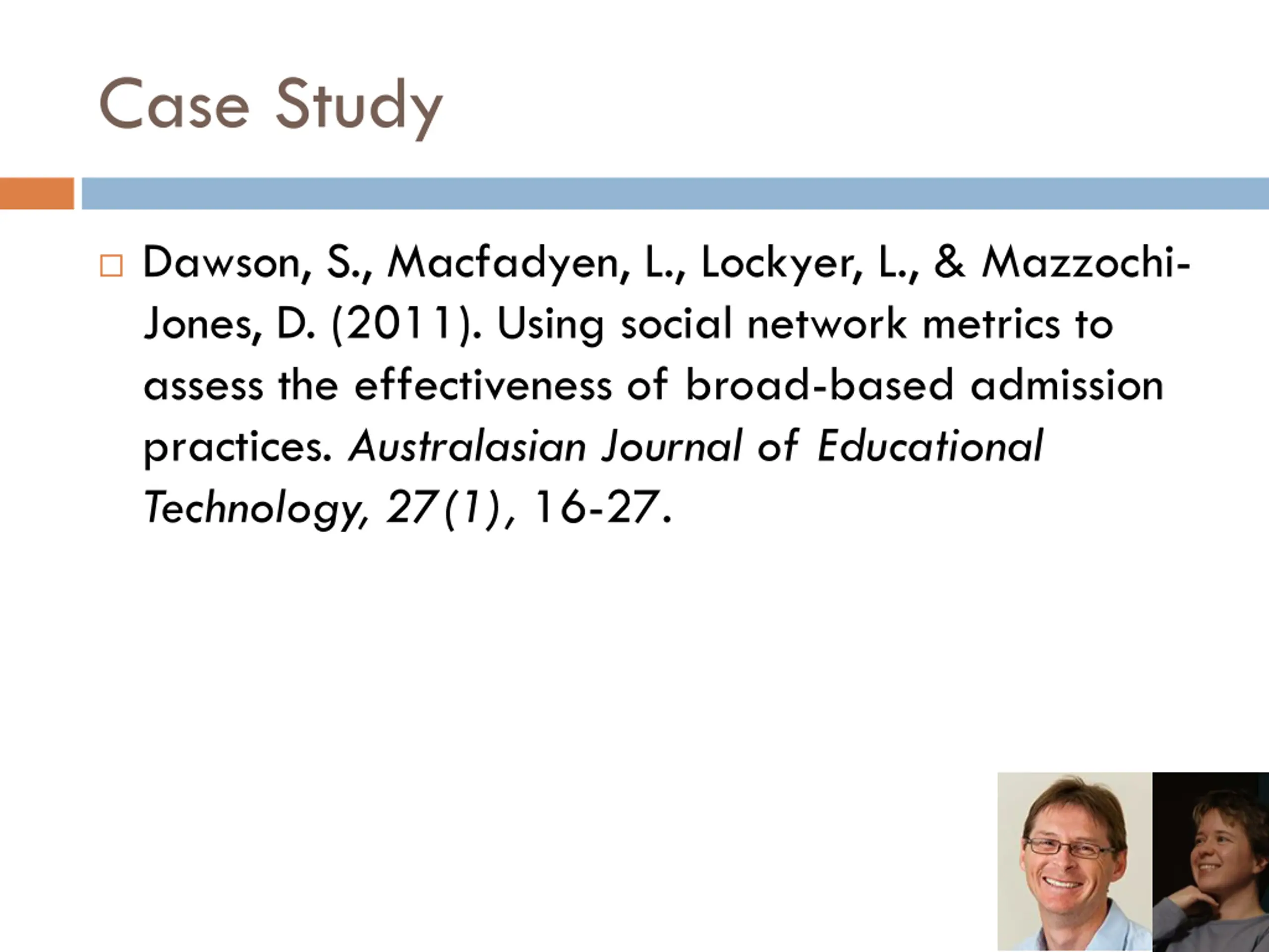 Case Study Dawson, S., Macfadyen, L., Lockyer, L., & Mazzochi- Jones, D. (2011). Using social network metrics to assess the effectiveness of broad-based admission practices. Australasian Journal of Educational Technology, 27(1), 16-27.
