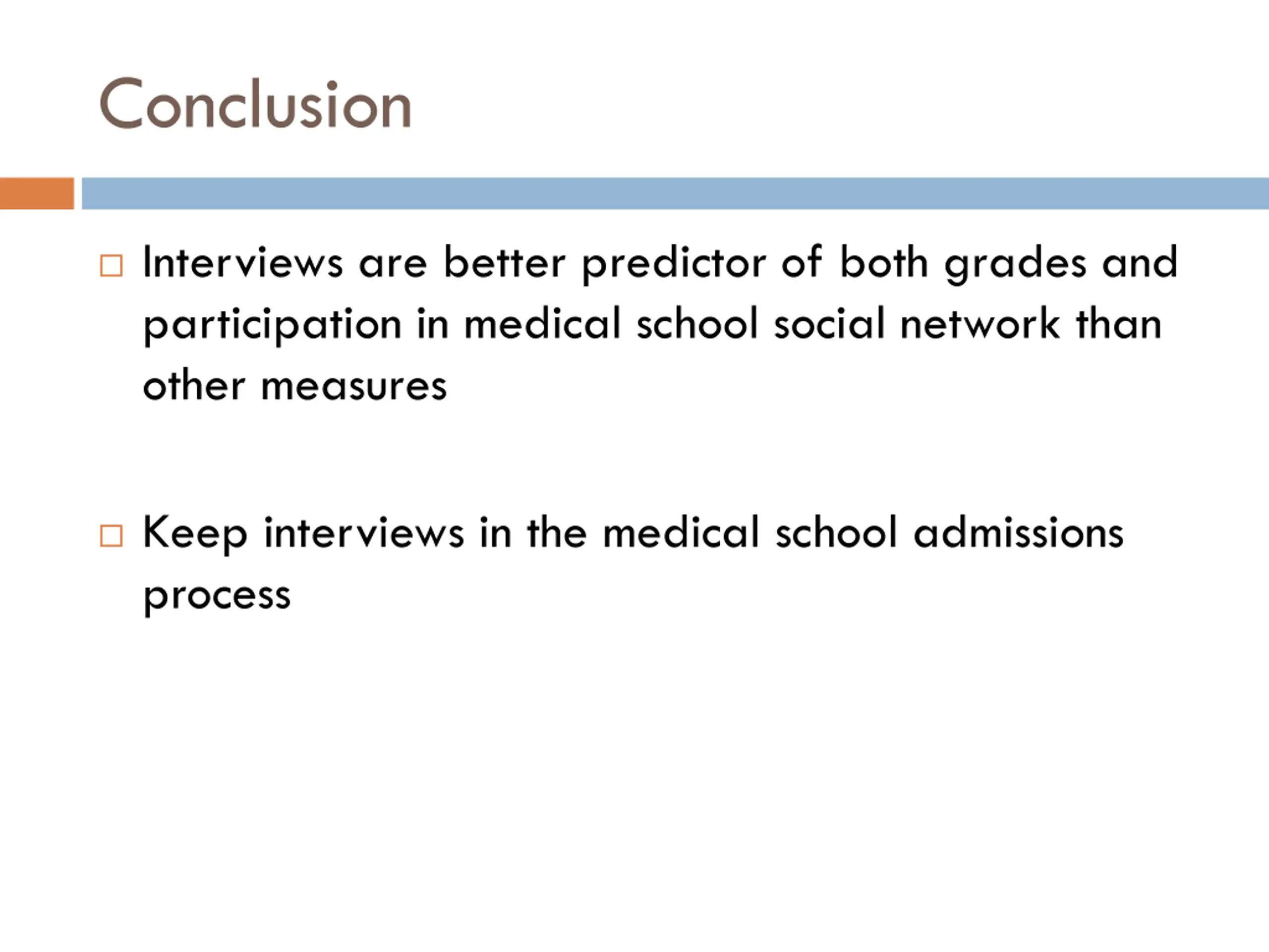 Conclusion Interviews are better predictor of both grades and participation in medical school social network than other measures Keep interviews in the medical school admissions process