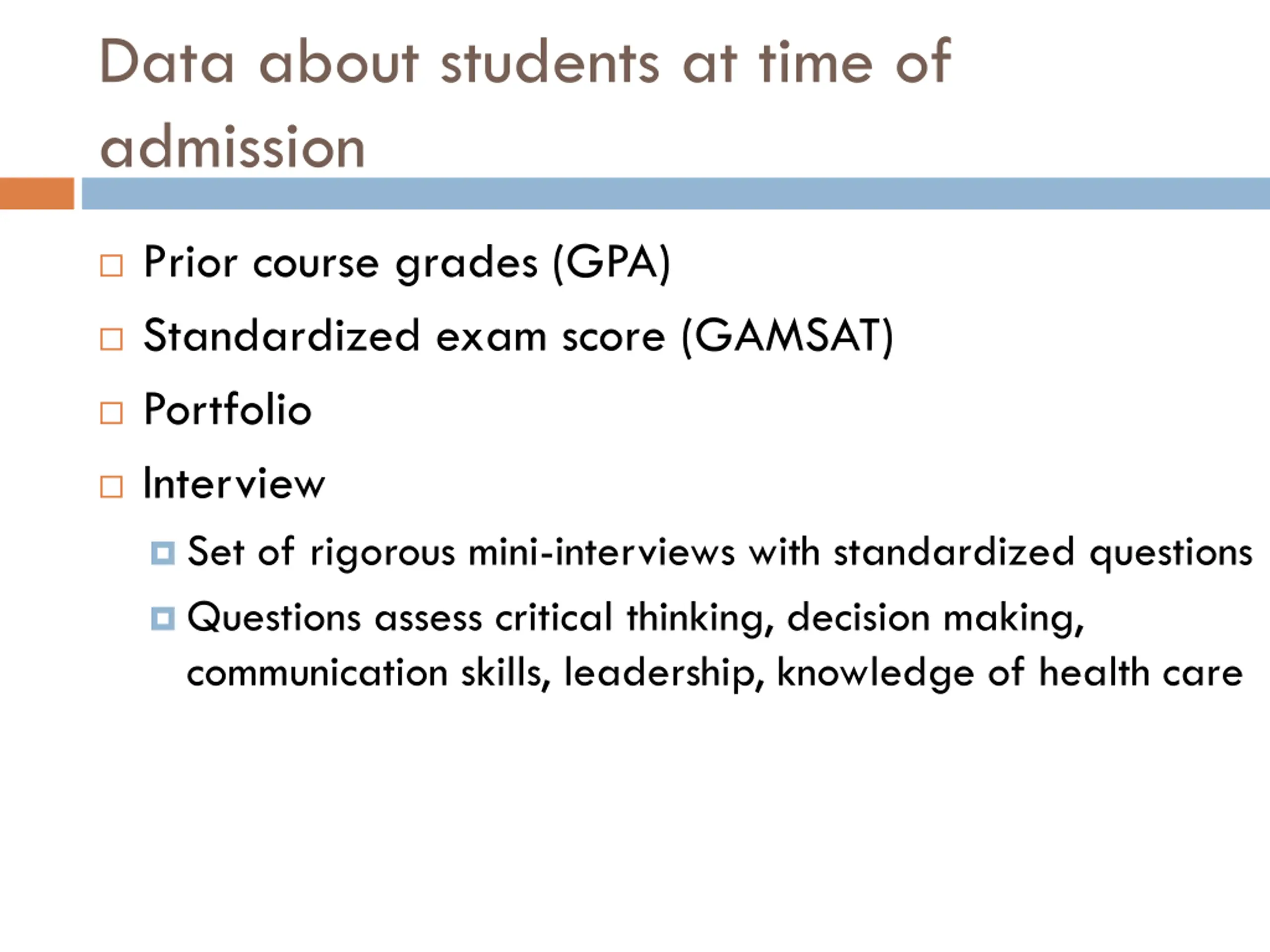 Data about students at time of admission Prior course grades (GPA) Standardized exam score (GAMSAT) Portfolio Interview Set of rigorous mini-interviews with standardized questions Questions assess critical thinking, decision making, communication skills, leadership, knowledge of health care