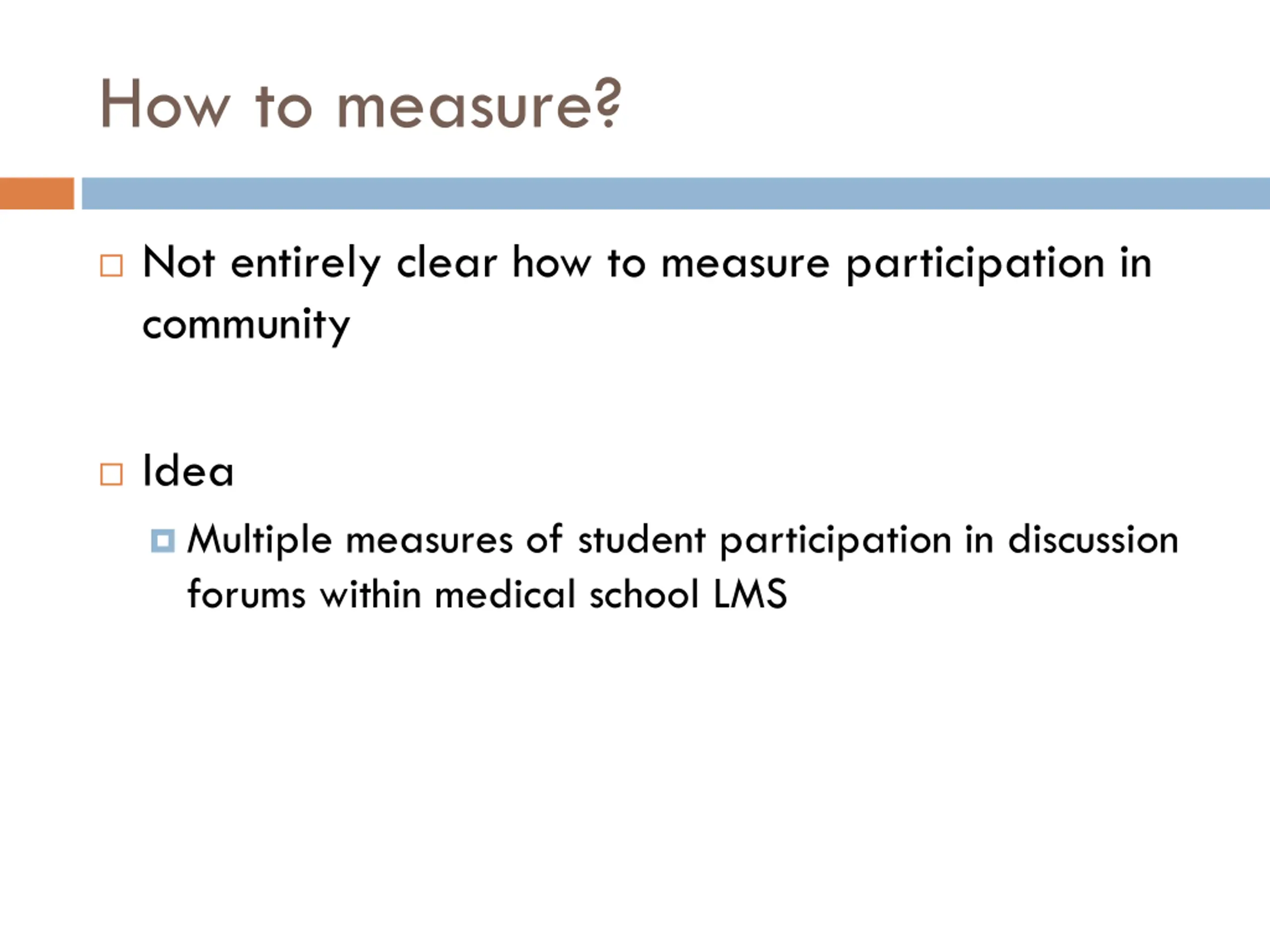 How to measure? Not entirely clear how to measure participation in community Idea Multiple measures of student participation in discussion forums within medical school LMS