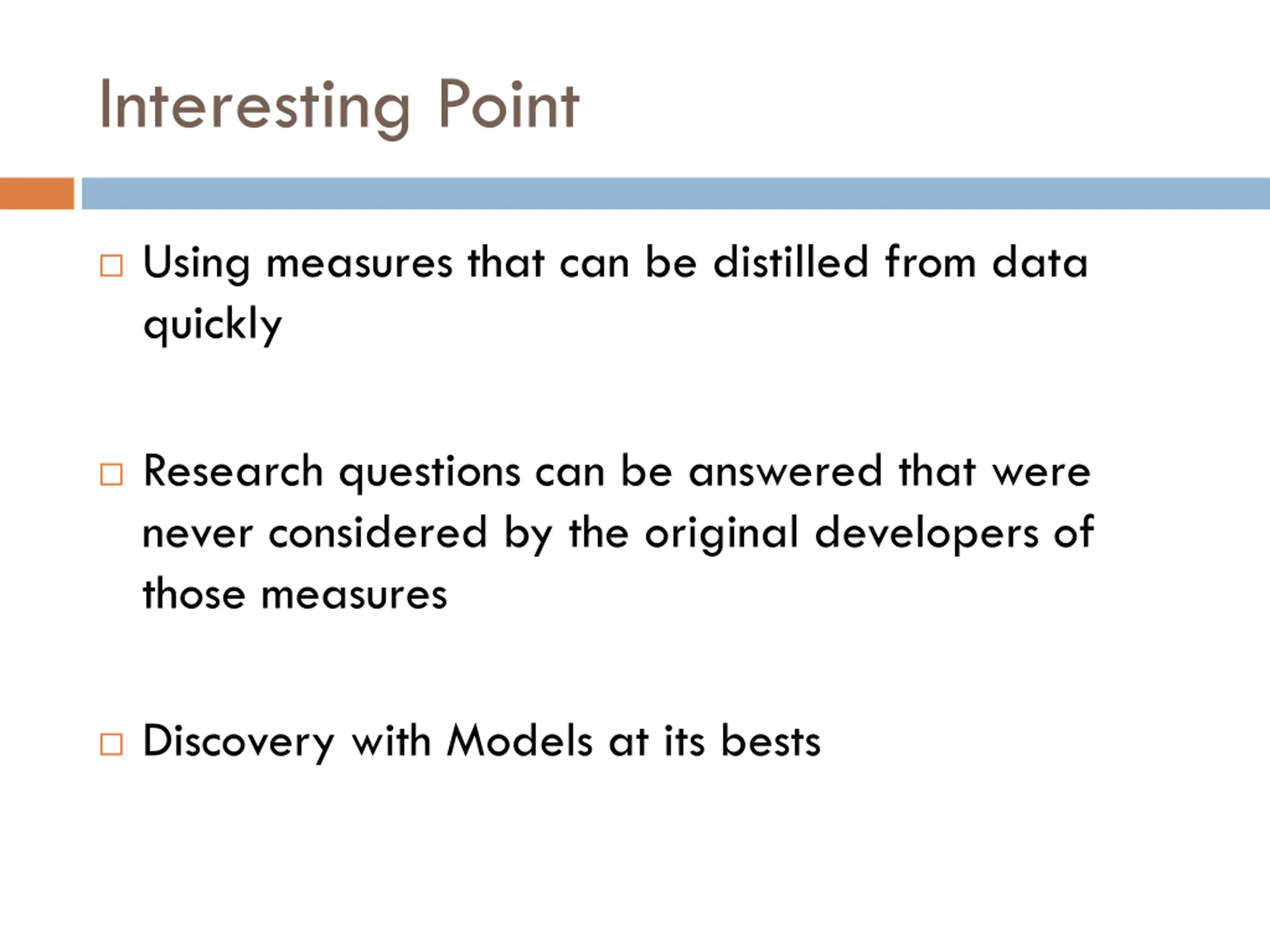 Interesting Point Using measures that can be distilled from data quickly Research questions can be answered that were never considered by the original developers of those measures Discovery with Models at its bests