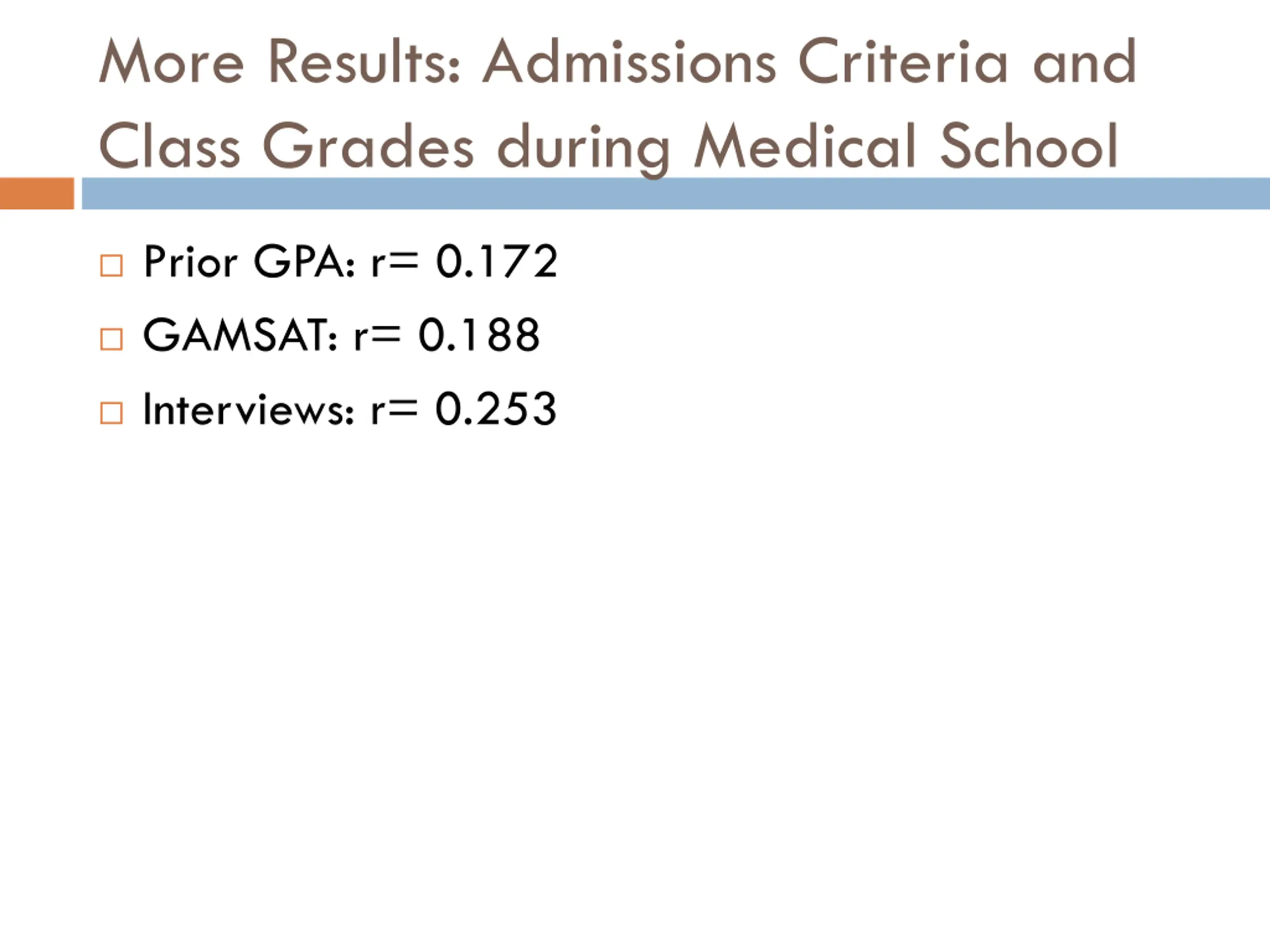 More Results: Admissions Criteria and Class Grades during Medical School Prior GPA: r= 0.172 GAMSAT: r= 0.188 Interviews: r= 0.253
