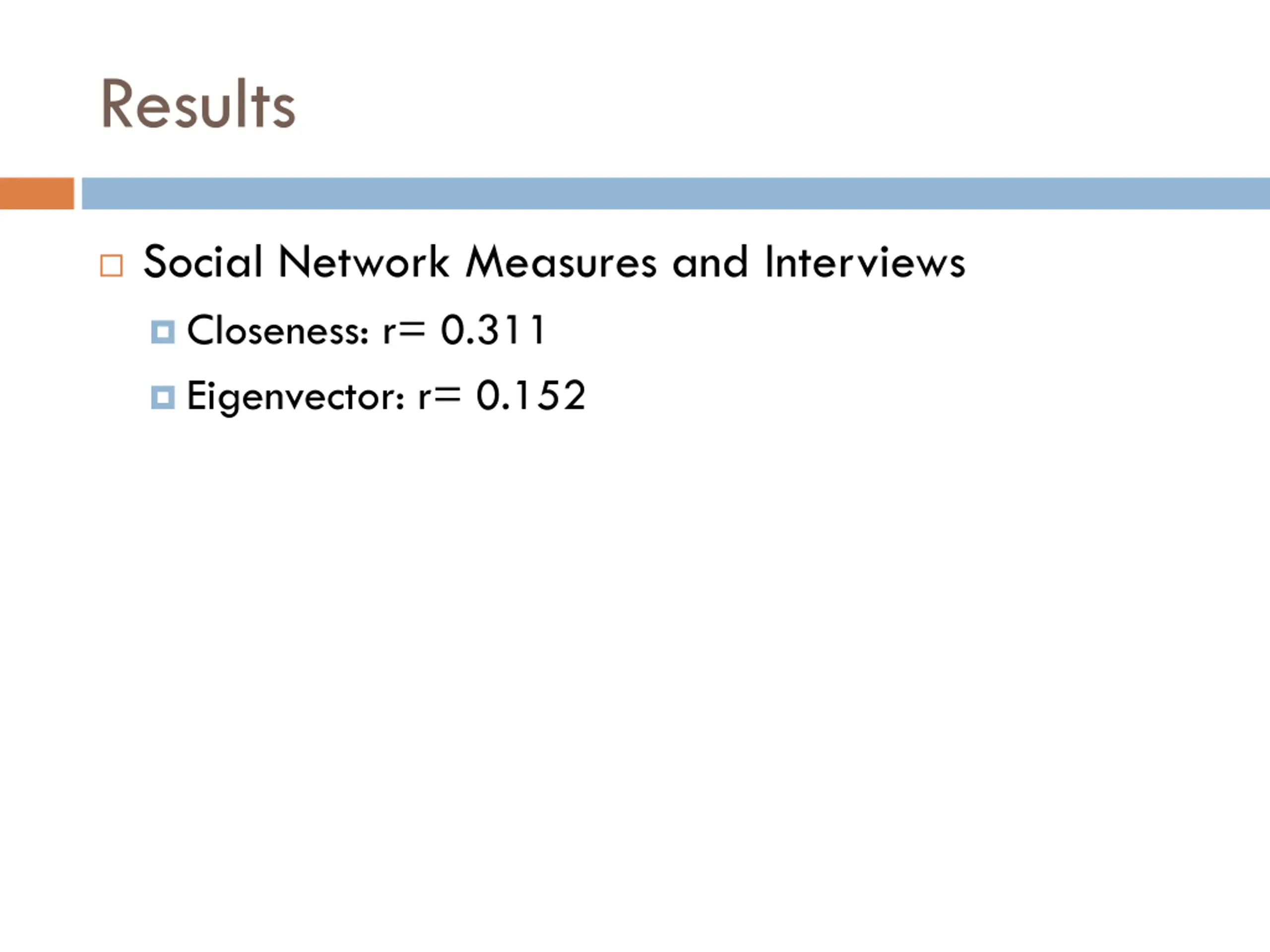 Results Social Network Measures and Interviews Closeness: r= 0.311 Eigenvector: r= 0.152