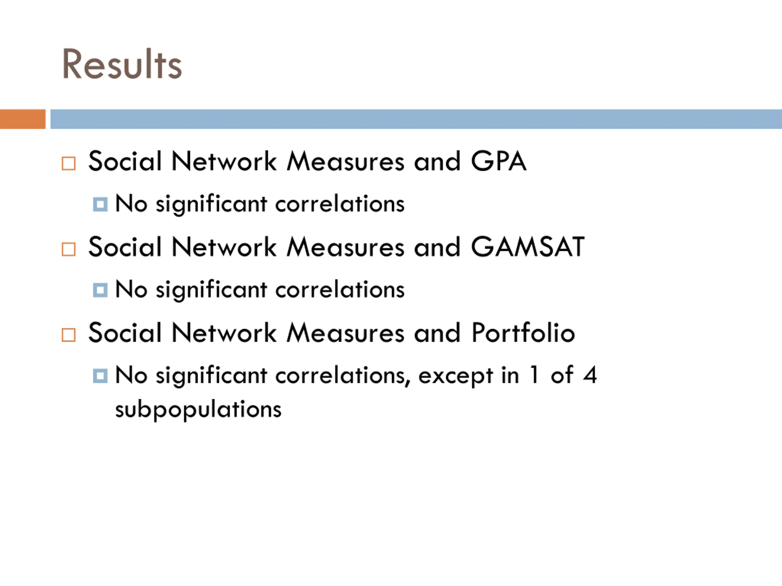 Results Social Network Measures and GPA No significant correlations Social Network Measures and GAMSAT No significant correlations Social Network Measures and Portfolio No significant correlations, except in 1 of 4 subpopulations