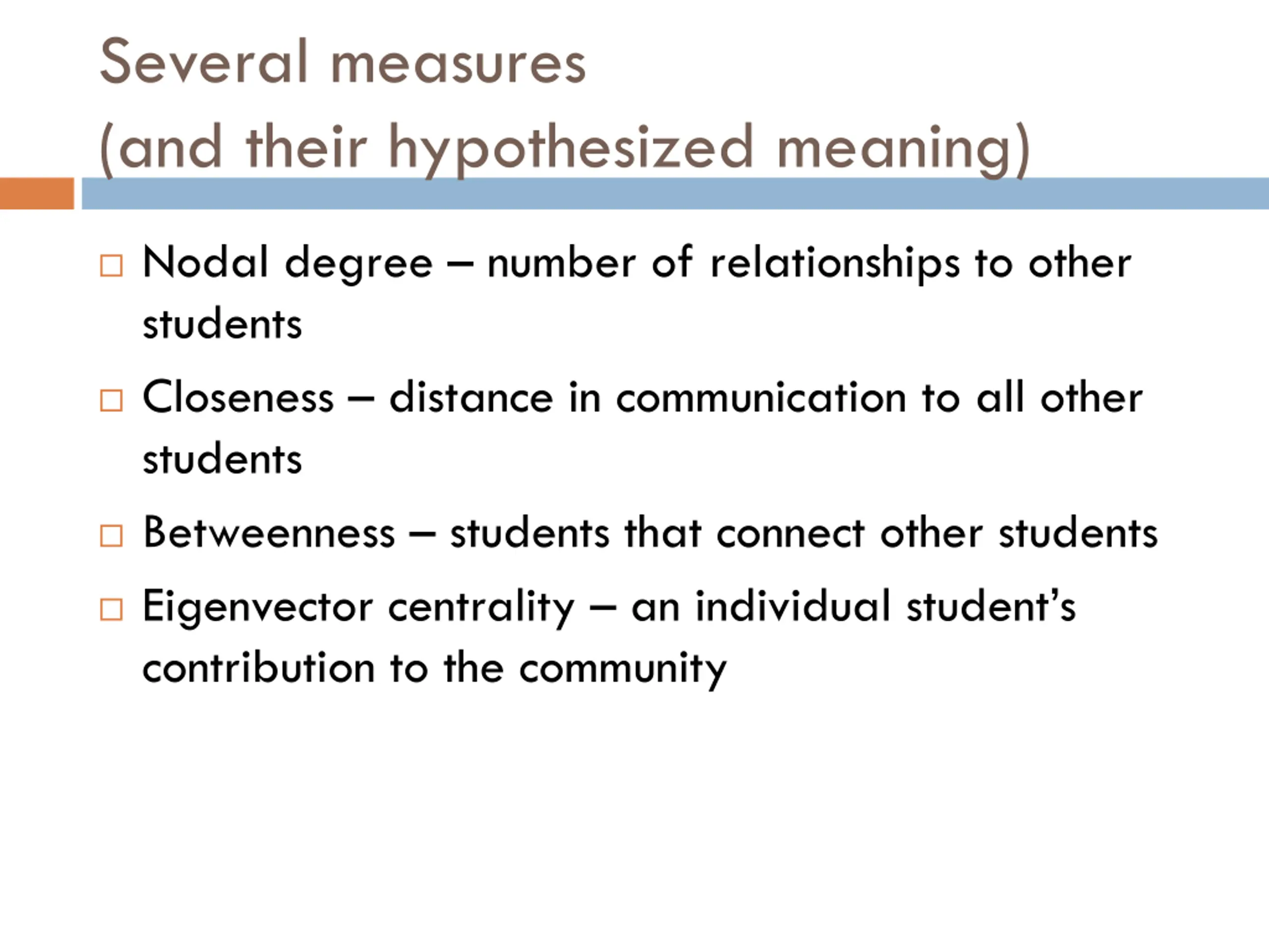 Several measures (and their hypothesized meaning) Nodal degree number of relationships to other students Closeness distance in communication to all other students Betweenness students that connect other students Eigenvector centrality an individual student s contribution to the community