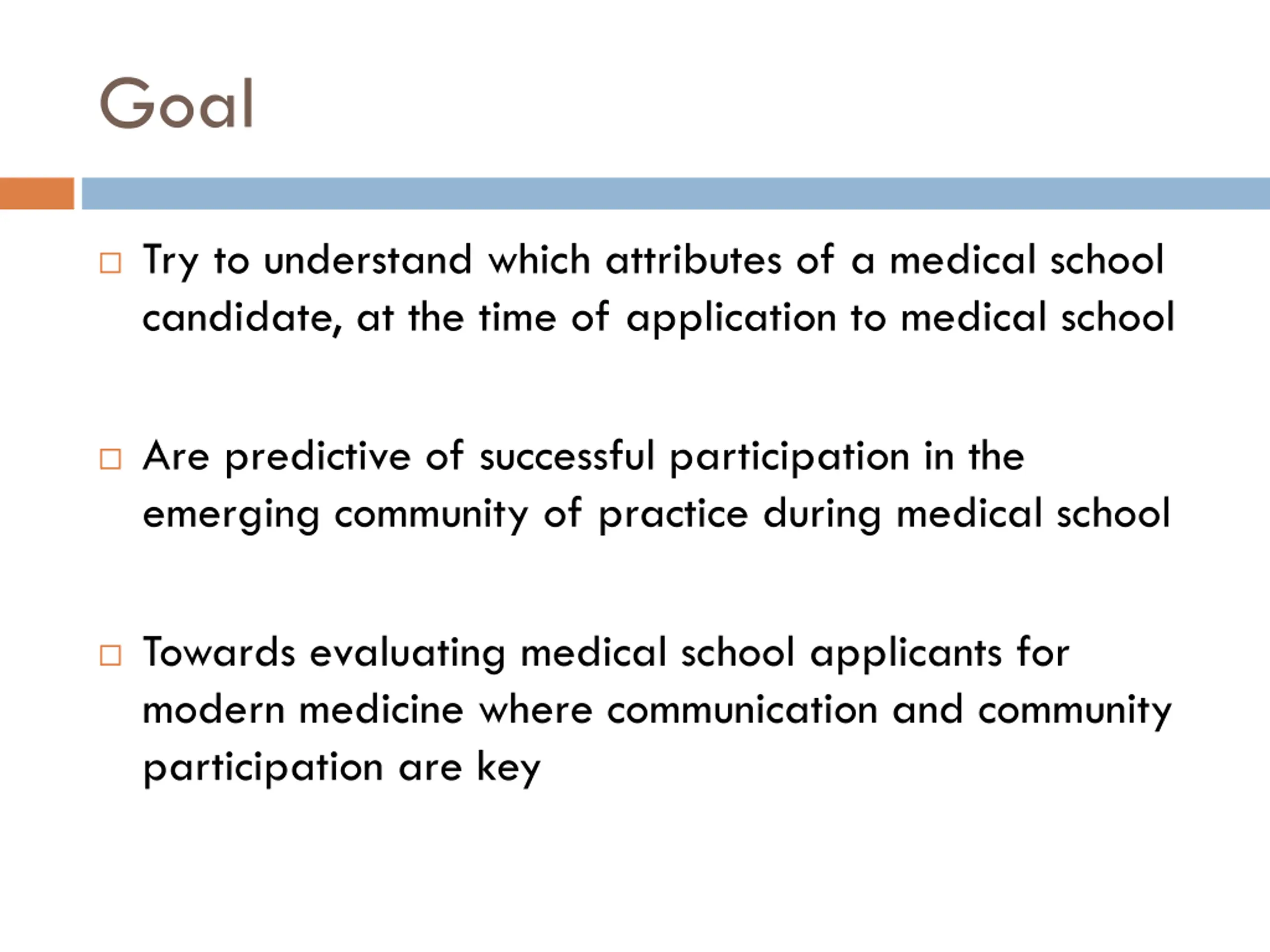 Goal Try to understand which attributes of a medical school candidate, at the time of application to medical school Are predictive of successful participation in the emerging community of practice during medical school Towards evaluating medical school applicants for modern medicine where communication and community participation are key