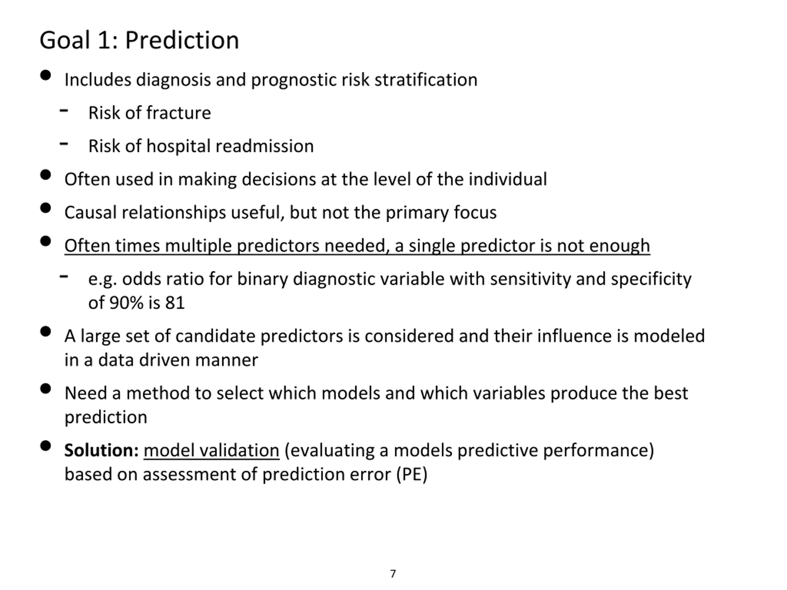 Goal 1: Prediction Includes diagnosis and prognostic risk stratification - Risk of fracture - Risk of hospital readmission Often used in making decisions at the level of the individual Causal relationships useful, but not the primary focus Often times multiple predictors needed, a single predictor is not enough - e.g. odds ratio for binary diagnostic variable with sensitivity and specificity of 90% is 81 A large set of candidate predictors is considered and their influence is modeled in a data driven manner Need a method to select which models and which variables produce the best prediction Solution: model validation (evaluating a models predictive performance) based on assessment of prediction error (PE) 7