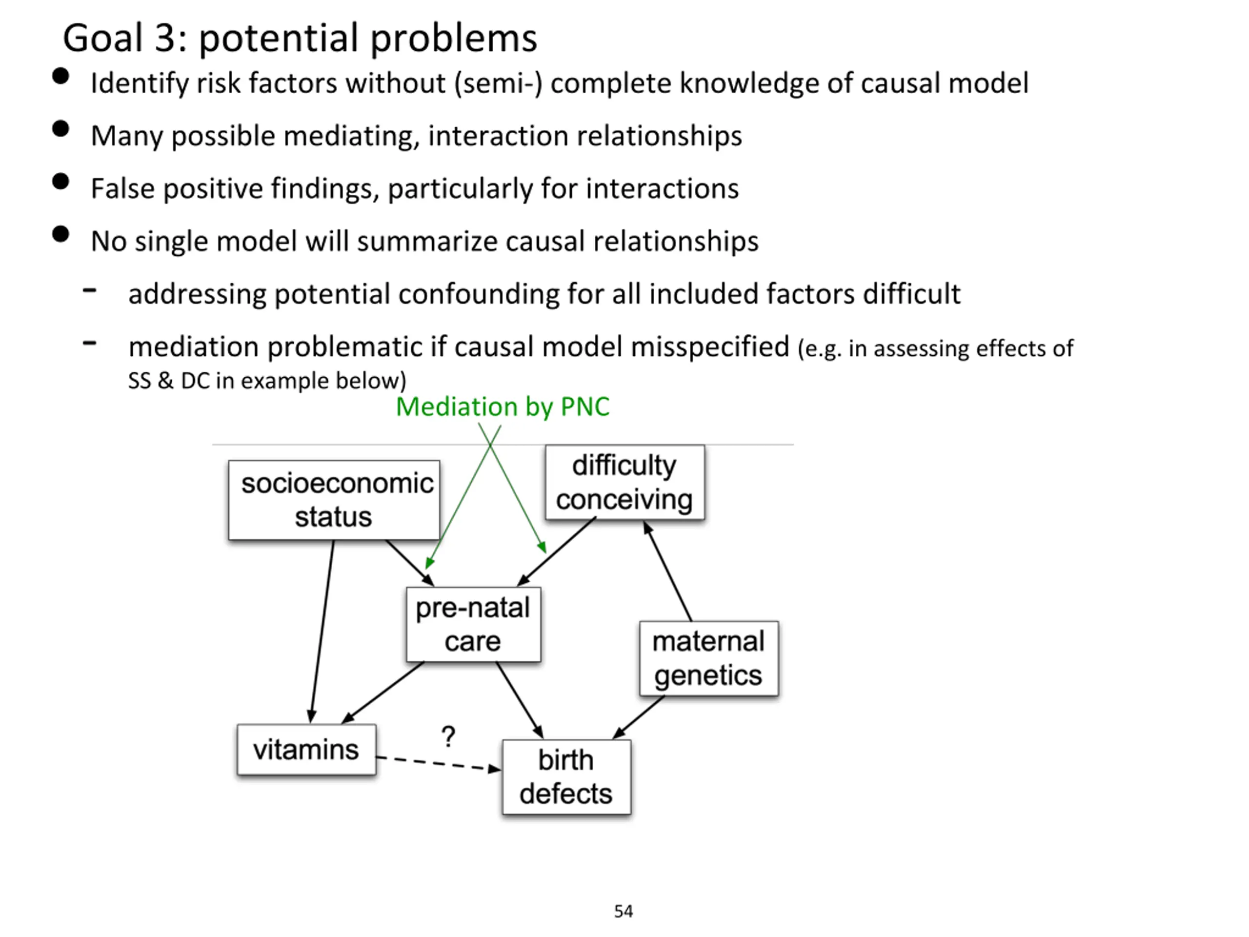 Goal 3: potential problems Identify risk factors without (semi-) complete knowledge of causal model Many possible mediating, interaction relationships False positive findings, particularly for interactions No single model will summarize causal relationships - addressing potential confounding for all included factors difficult - mediation problematic if causal model misspecified (e.g. in assessing effects of SS & DC in example below) Mediation by PNC 54