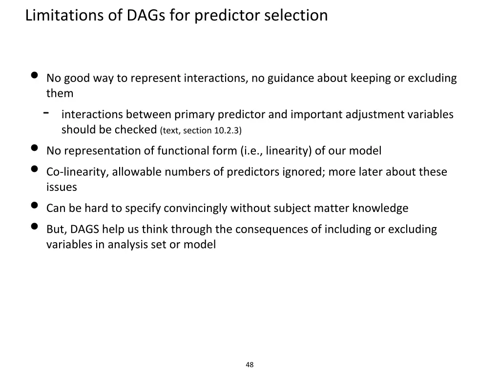 Limitations of DAGs for predictor selection No good way to represent interactions, no guidance about keeping or excluding them - interactions between primary predictor and important adjustment variables should be checked (text, section 10.2.3) No representation of functional form (i.e., linearity) of our model Co-linearity, allowable numbers of predictors ignored; more later about these issues Can be hard to specify convincingly without subject matter knowledge But, DAGS help us think through the consequences of including or excluding variables in analysis set or model 48
