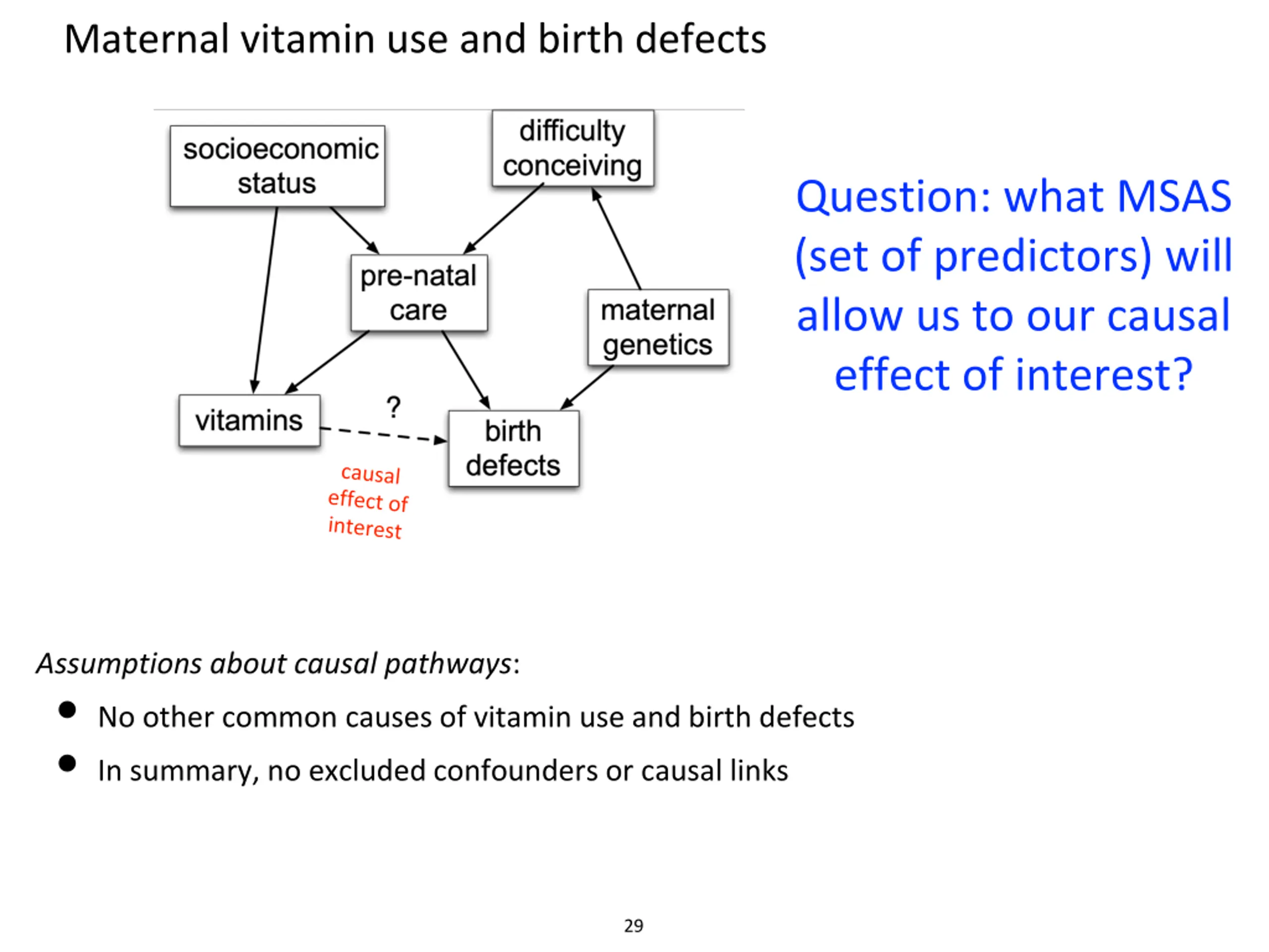 Maternal vitamin use and birth defects Question: what MSAS (set of predictors) will allow us to our causal effect of interest? Assumptions about causal pathways: No other common causes of vitamin use and birth defects In summary, no excluded confounders or causal links 29