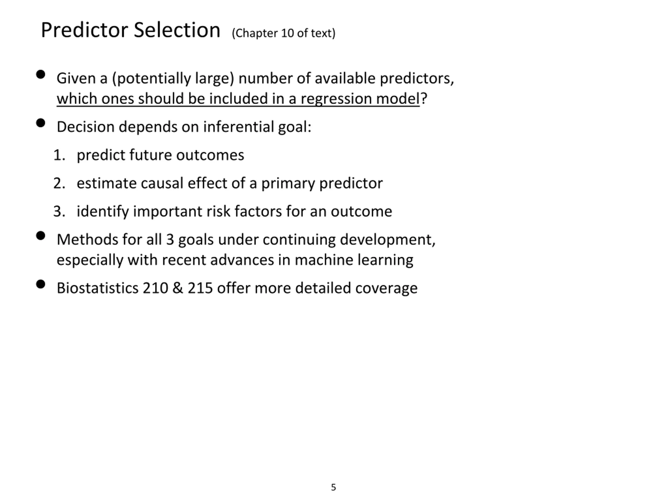Predictor Selection (Chapter 10 of text) Given a (potentially large) number of available predictors, which ones should be included in a regression model? Decision depends on inferential goal: 1. predict future outcomes 2. estimate causal effect of a primary predictor 3. identify important risk factors for an outcome Methods for all 3 goals under continuing development, especially with recent advances in machine learning Biostatistics 210 & 215 offer more detailed coverage 5