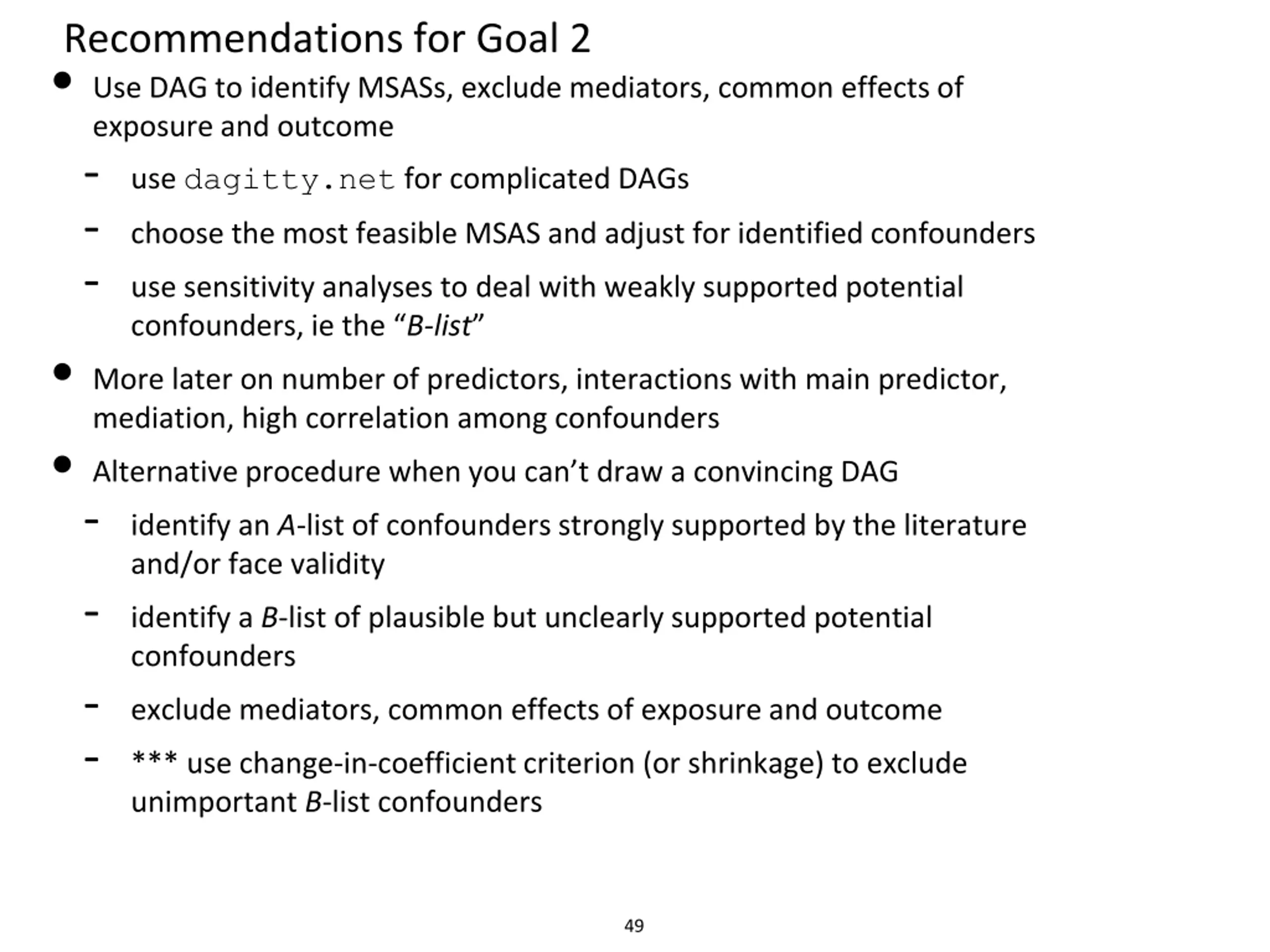 Recommendations for Goal 2 Use DAG to identify MSASs, exclude mediators, common effects of exposure and outcome - use dagitty.net for complicated DAGs - choose the most feasible MSAS and adjust for identified confounders - use sensitivity analyses to deal with weakly supported potential confounders, ie the B-list More later on number of predictors, interactions with main predictor, mediation, high correlation among confounders Alternative procedure when you can t draw a convincing DAG - identify an A-list of confounders strongly supported by the literature and/or face validity - identify a B-list of plausible but unclearly supported potential confounders - exclude mediators, common effects of exposure and outcome - *** use change-in-coefficient criterion (or shrinkage) to exclude unimportant B-list confounders 49
