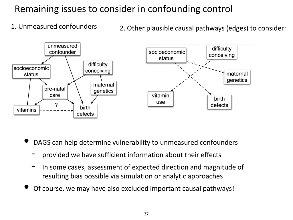 Remaining issues to consider in confounding control 1. Unmeasured confounders 2. Other plausible causal pathways (edges) to consider: DAGS can help determine vulnerability to unmeasured confounders - provided we have sufficient information about their effects - In some cases, assessment of expected direction and magnitude of resulting bias possible via simulation or analytic approaches Of course, we may have also excluded important causal pathways! 37