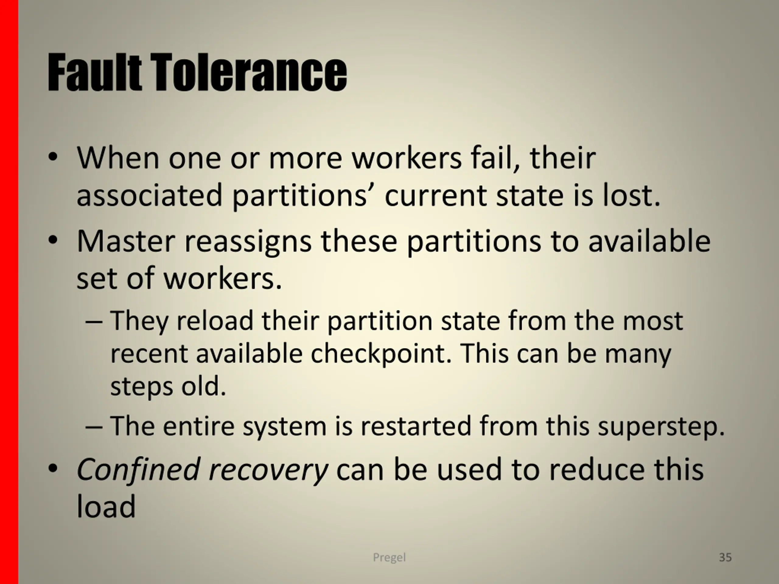 Fault Tolerance Checkpointing is used to implement fault tolerance. At the start of every superstep the master may instruct the workers to save the state of their partitions in stable storage. This includes vertex values, edge values and incoming messages. Master uses ping messages to detect worker failures. Pregel 34