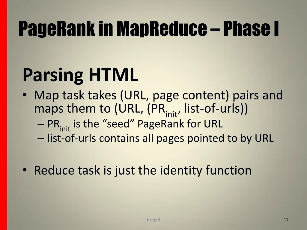 PageRank in MapReduce Phase I Parsing HTML Map task takes (URL, page content) pairs and maps them to (URL, (PRinit, list-of-urls)) PRinitis the seed PageRank for URL list-of-urls contains all pages pointed to by URL Reduce task is just the identity function Pregel 41