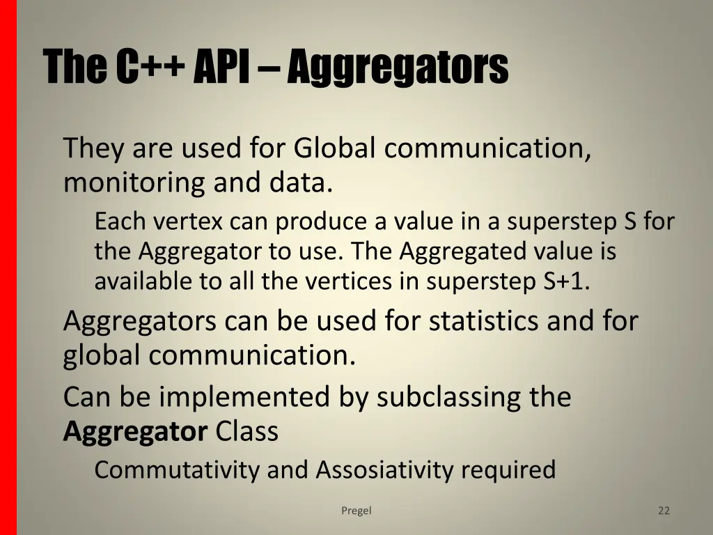 The C++ API Aggregators Example: Sum operator applied to out-edge count of each vertex can be used to generate the total number of edges in the graph and communicate it to all the vertices. - More complex reduction operators can even generate histograms. In the MaxValue example, we can finish the entire program in a single superstep by using a Max aggregator. Pregel 23