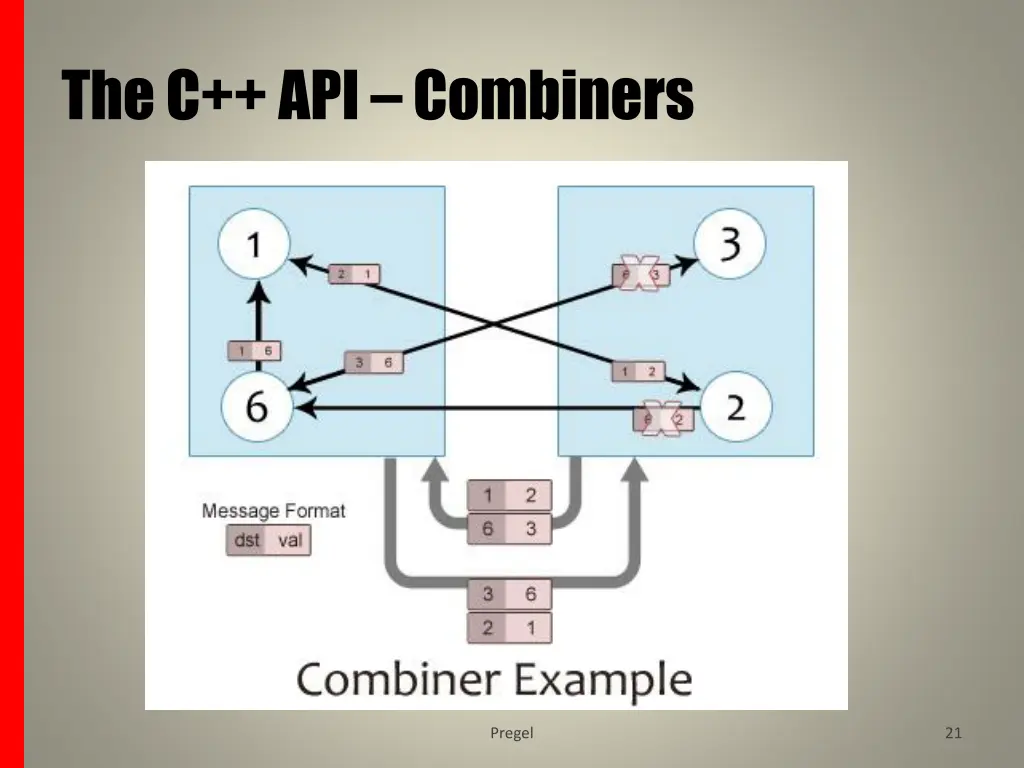 The C++ API Combiners Example: Say we want to count the number of incoming links to all the pages in a set of interconnected pages. In the first iteration, for each link from a vertex(page) we will send a message to the destination page. Here, count function over the incoming messages can be used a combiner to optimize performance. In the MaxValue Example, a Max combiner would reduce the communication load. Pregel 20