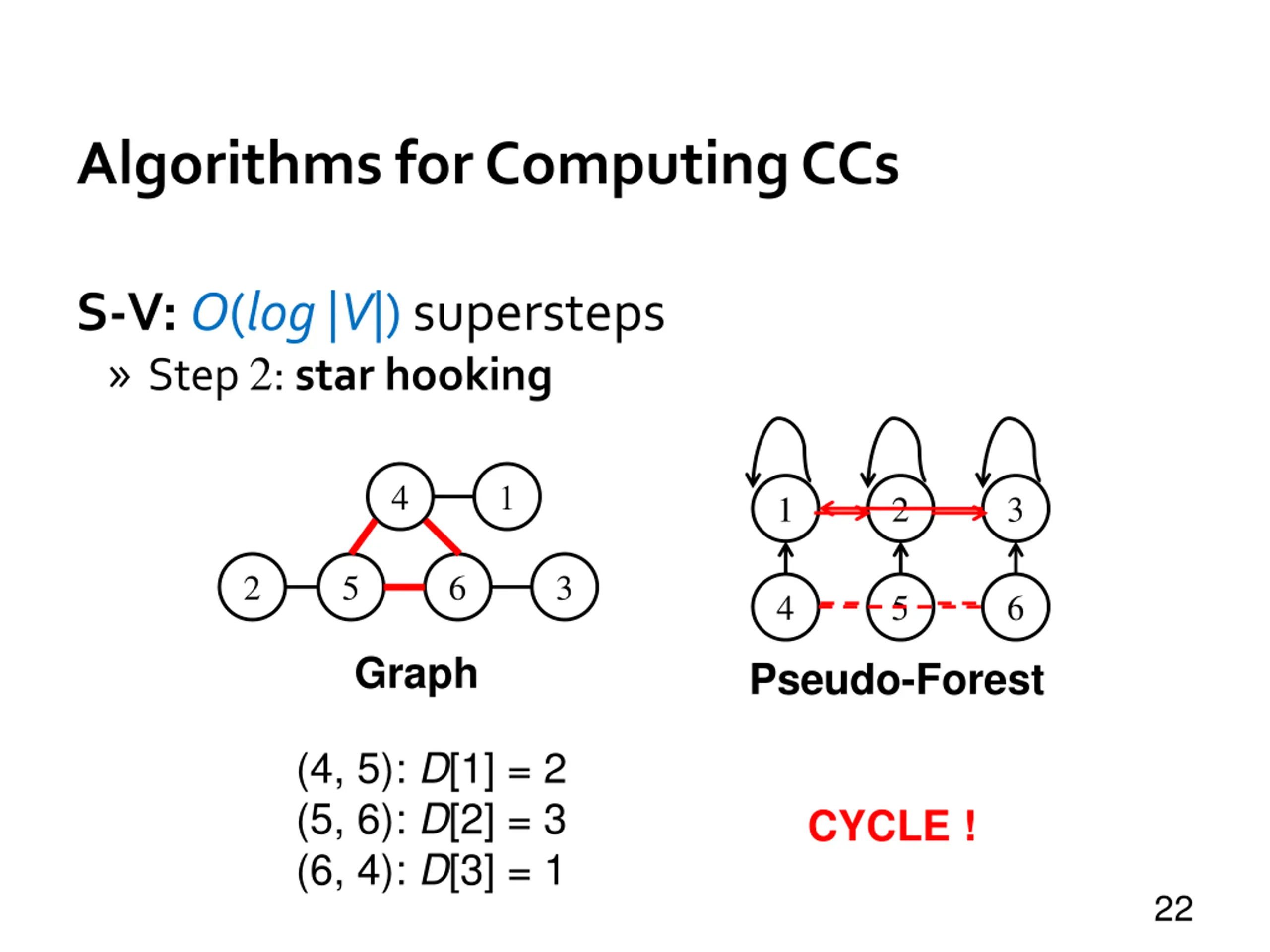 Algorithms for Computing CCs S-V: O(log |V|) supersteps Step 2: star hooking x Require D[v] < D[u] in Pregel v w u No constraint in PRAM S-V 21
